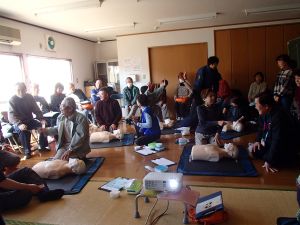 近隣の町内会合同で救急救命法の講習会が集会所で開催された。休日の朝8時半から3時間の内容でハンパじゅない。行ってみて更に驚いた。地域住民35名位、ボランティアの応急手当普及員が7名、本市の消防本部からも3名と大盛況の賑わいで集会所は満杯だった。皆さん、何て真面目なの!!講習会はものすごく分かりやすくて身についた。全員を7つのブースに分けてそこに応急手当員が1名づつ配置され、中央では消防職員がプロジェクターで説明する。一人一人実習するのだが全部をやらず段階毎に少しづつ進めて最後に通して行う。スクリーンの画像を見ながら、側で普及員がアドバイスしてくれるので何のストレスも戸惑いもなく楽しく実習できて画期的だった。在職中に受講したこの手の講習会はヒヤヒヤが多くてストレスがたまった割りには身につかなかった。 沢山の受講者が熱心に取り組む 胸骨圧迫 AEDと心肺蘇生法の実施心肺蘇生法、AEDの操作を一人づつ実習し、最後に二人一組で救命処置の流れをこなした。いい講習会だった。万一の時に何か役立てそうな気になった。