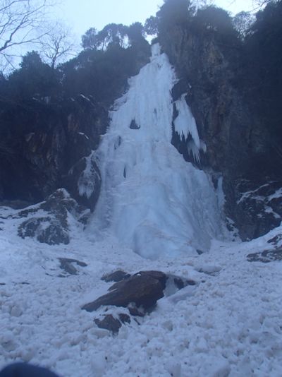 朝起きると昨夜降った雪でテントが重くなっていた。最終日はこの辺りで最も難しいとされている左岩壁右ルートに行った。天気は6時から雪の予報。深い雪の急斜面を詰めていくとF1が威圧的に出迎えてくれる。滝の巾が狭く完璧なバーチカルアイスだ。明らかに昨日迄の氷とは趣が異なっているのがわかり、緊張して沈黙してしまった。 左岩壁遠景 近づくと威圧的こんなの私にできないよぉと寒さと武者震いでガタガタ震えていたが、ここでひるんで萎縮し、逃げの姿勢になるんだったら何の為に苦労してここまで来たの?うまくいこうが行くまいが自分の精一杯の力を出してぶつかっていくしかないじゃないの、いつもの勇気を出せ!!と自分を鼓舞し、叱咤激励した。覚悟が決まったら気持が落ちつき、意欲的になって力を抜いて取り付けた。ビレイしている間にどんどん冷え込み、自分が昇る頃には手がかじかんでアックスを握る指の感覚がなくなってしまった。スタートした。昨日の反省点を常に思い出し、三角形または一直線の形を作ることに厳密に護った。足を蹴りこむ場所が垂直でとっかかりが無いといつも逃げて形を崩していたので、とにかく手の直下に反対の足を持ってくることに集中した。打点は割といい場所があったが身長が短く届かないので思いっきり腕を伸ばしたがそうすると蹴りこむ足の場所が見にくくなる。おまけに昨夜来の雪で冷えこんでいてカラビナが凍り付いて回収に手間がかかった。ここで頑張らなければ私じゃない!!という気力でF1を昇った。するとその上に下からは見えなかったF2とF3が純白な姿で私達を見下ろしていた。 純白で清楚な姿 F2 F3へ向かう F2はF1に比べると普通の滝だった。これが最後の滝と言い聞かせて上まで昇ると更にF3のつらら状の姿が迫る。通常昇れないらしいが今年は昇れるかもとガイドが氷柱の裏表をチェックしたがやはり崩落するリスクを考え見送る。この頃になると予報通り雪がしっかり降りしきり、標高が上がった分だけ風も出てきて空気が冷えこみとにかく寒い。顔は凍え手もかじかんで悲壮感すら漂う状況になってきた。ただちに懸垂下降を始め、ブッシュ帯をすり抜けF2、F1と3回の懸垂で取り付き地点に降り立った。 地面に足が着いて無事生還した。やったね!!という気持がこみ上げてきた。心から嬉しかった。この滝を昇れたんだと改めてF1を眺めると最初の威圧感は薄らぎ、不思議なことに親近感が湧いてきた。 F1をバックに
