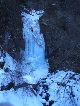 長野県上田市から菅平スキー場方面に向かい更に山中に入ると大谷不動尊というお不動様を祭っている奥の院がある。その周辺は多彩なバーチカルアイスが屹立するエリアになっていていつか行ってみたいと思っていたが、難しいので私なんぞが行く場所ではないと思っていた。今回機会があって2泊3日のテント泊で大谷不動にアイスクライミングに行った。始発の新幹線で上田まで行き、そこからは車で菅平スキー場に入り須坂青年の家に届けを出して駐車。その先は雪道をスノーシューを付けて樹林の中を下ったり登ったりして1時間20分ほどで大谷不動尊奥の院に到着。近くの樹林の中にテントを張った。出発の時に一緒だったオーストラリア人男性二人もテントを張っていた。 須坂青年の家 駐車場 お隣はオーストラリアチーム スノーシューを履いて 小さな鐘がかわいい指導標 大谷不動尊奥の院 テント設営テントの中にシュラフなど不要な物を入れ、すぐにけっこう深い雪をトラバースして登っていくとドーンと50mほどの見事なスケールの滝が登場した。ロットの滝(不動前)でこれが最も易しい滝だという。ええ~、これが一番易しい?!!見るところ、比較的なだらかな下段、垂直の中段、二つに分かれた完璧なバーチカルアイスの上段の三部分からできている。 ロットの滝全景気力を奮い立たせて何とか真ん中を昇り、更にルートを左・右と変えて3本昇った。午後から50mの滝を3本だから3本目は昇れないかもしれないと思いつつも頑張って昇った。 ロットの滝 左下はオーストラリアチーム氷がこれまでの滝より硬くてアックスが決まりにくかった。不安に思って何度も打って疲れた。でも何とか昇れて少し安堵した。