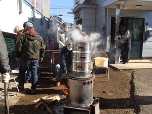2月1日町内会の第6回餅つき大会の日が来た。すっきり晴れた好天に恵まれたが、風が冷たくて登山にでもいくようなスタイルで朝8時半、集会所に行った。昨日よりさらに大勢の町内の皆さんが集まって、それぞれの分担で仕事を進めた。(ちゃんと計画がたててあったのに会議に出ていない私が知らなかったということです) 餅米を蒸す 長机に座布団を出して会場設営 汁物つくり私の仕事は受付で来賓のチェック、ご祝儀の授受・確認、お土産渡しだった。各分担でそれぞれに仕事をすすめ、10時頃から餅つきが始まった。青い法被を着て威勢よくかけ声を掛けて餅をついていた。突き上げた餅は女性陣がパックに入れてあんこときなこの二種類の餅にした。 餅つき始まる 町内会長さんも 市長さんも11時過ぎ頃からは町会関係の来賓、行政関係の来賓が次々と到着して賑わった。市長、市議会議長、県会議員、(この前の選挙で私が一票を投じて当選した!!)衆議院議員などいつものメンバーが揃った。若い市長さんは慣れた手つきで餅をつかれていた。町内の家族連れやお年寄りなどけっこうたくさんの皆さんが来場して大賑わいだった。子供たちはお餅をつかせてもらったり、ジュースを飲んだりして楽しそうだった。 大勢の参加者で賑わう 来賓の皆さん