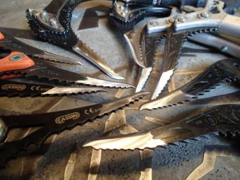 尾白のルンゼでクライミングしている時、アイスアックスの切れ味が悪くなっているのに気づいた。シーズン初めは氷への刺さり方がサクッとして一発で決まり、切れ味抜群の日本刀と言う感じだったのが、いつの間にかなまくら刀になっていてサクッと鋭く氷に入らない。数回打ってもガシッガシッという風で切れ味が悪い。きっと犬殺しの3ピッチ目辺りで岩を叩いて先端が磨耗したのだろう。2月5日関東地方は雪の予報。私の住む湾岸地方は朝から冷たい雨が降り、冷凍庫に入ったような沈鬱さ。でもこんな日こそうまく活用しなくちゃとアックスを持って四ッ谷の登山用品店まで出向いた。研ぎ師の凹助さんに診てもらって刃を少し薄く削り、先端を尖らせてもらった。再びゾクッとする冷たい輝きが蘇った。しかし刃先が大分短くなってきているから来シーズンは交換だねと言われた。オーナーの凹助さんの研ぎ腕はプロ中のプロなので、工房にはいつも要調整のアックスがたくさんあって忙しそう。アイスクライミングはギアの善し悪しが大きくものをいうスポーツなので誰もが頼りにしてしまう。 作業が順調にすすみ、電車も混乱しないで無事帰宅できた。結局雪はたいして降らなかった。