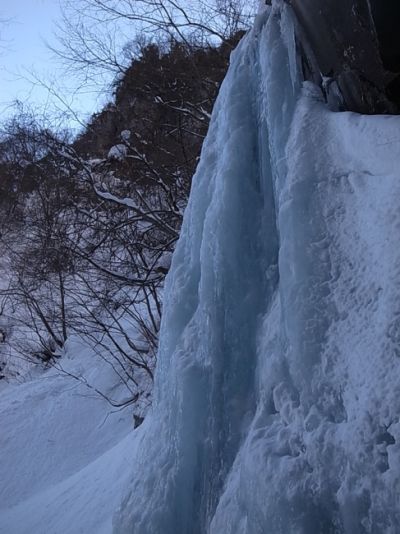 2月2日1年ぶりに小川山山麓の岩根アイスツリーに出かけた。たまにはゲレンデアイスで基本の復習をしようと思ったのだ。痛列な冷え込みだったが、空気は澄み、空は一点の陰りもなく真っ青に晴れ渡り、正にアイス日和だった。参加者は4名、私以外は30歳代の息子世代の男性たちだった。みんな好青年だった。土日にミレーのアイス講習会があったせいか、打ち込まれ踏み蹴られて氷面はぼこぼこになっていた。緩斜面から始めてH型からA型などスタイルも変えて1日昇った。私は足の蹴りこみが弱いのでそれを少しでも改善しようと、「足、足」と声に出して言いながら多分15、6本昇った。ゲレンデだけどけっこう充実した。