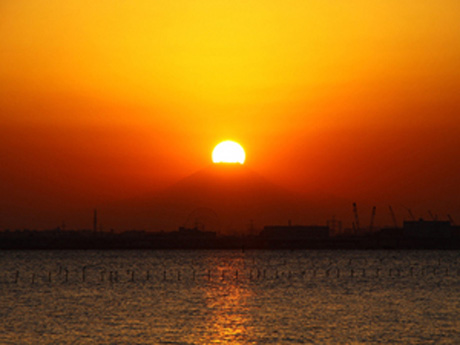 15日の夕方のニュースで隣町の船橋市でダイヤモンド富士が美しく見られたとラジオが言っている。えっ、船橋にそんないい場所があるの?それはどこ?と調べたら何とふなばし三番瀬海浜公園芝生広場だった。 「ダイヤモンド富士」とは、富士山頂に太陽が重なる瞬間、ダイアモンドダイヤモンドのように輝く現象を指す。富士山頂に夕日が沈む瞬間がダイヤモンドのようにとても美しいことから名付けられたという。同園とその周辺は、国土交通省が定める「関東の富士見百景」に船橋市で唯一認定されており、「ダイヤモンド富士」は気象条件がそろえば年に2回、2月中旬と10月下旬に見ることができるらしい。空気の澄んだ2月は特にすばらしく、富士山頂に沈む夕日とオレンジ色に染まる空と海はまさに自然の美とのこと。 船橋三番瀬公園 2月15日17時10分頃 (船橋経済新聞より)三番瀬公園というと干潟の環境保護運動という視点しかなかったのだけど、こんな絶好のスポットだったんだ。行ってみよう。