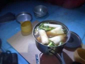 テント泊の楽しみ、それは何と言っても食事にある。というかそれしか無い。一日目の夕食はきりたんぽ鍋。家に居るときも何度かきりたんぽを食べていたが、テントの中で食べると美味しさ倍増。きりたんぽのお米のザラザラ感がいい。何より温かくて身も心も温まる。2日目の夕食は炊き込みご飯、味噌汁、ポークソテーとこれもご馳走だった。ポークソテーの塩味が昼間の労働で使った塩分補給になって体に効いた。2日間ともデコポンがデザートについていてそのみずみずしさとジューシーさが貴重でぜいたくだった。 朝食は基本的に前夜の鍋物の汁を利用したおじや。それに飲む点滴と言われる甘酒を飲む。ハーネスを着ける関係で珈琲は我慢する。次の愉しみは団欒だ。山での経験、友達との交流、山道具のあれこれ、本、音楽、これからの山行の夢や希望、いろいろな話題で尽きることがない。でもいつも8時にはシュラフに入って眠る。テント泊にも慣れてきて寒さを防ぐ方法や道具のまとめ方、座り方など大分身について違和感がなくなってきた。