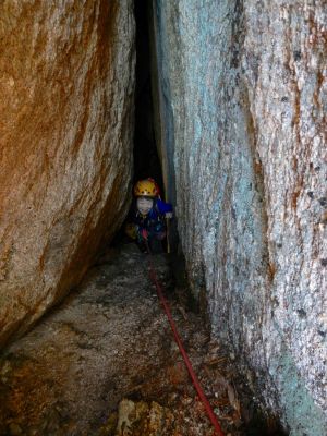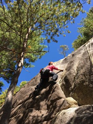 マニュフェストが順調に昇れてすっかり気持が楽になった翌日は直上ルートを昇った。直上ルートは左岩稜から南壁間のいわゆる正面壁にある顕著な帯状ハング帯の中央やや左をダイレクトに越えて中央バンドに直上するラインである。前日、前傾壁だと聞いた時から「私、昇れるかな?」という一抹の不安はあった。 直上ルート1ピッチ目を順調に昇り、2ピッチ目は脆いバルジを左上して前傾壁の下へ出るのだがここでまず1回目のピンチ。バルジを越えられないのだ。散々手こずった挙げ句にやっと前傾壁下に着く。5.9にこんな時間かかってたんじゃ核心はどうなるの?という不安が更に強くなってきた。不安は命中し、前傾壁で2回目の大ピンチに陥った。 前傾しているため岩が足元から胸にかけてせり出してくるのでまっすぐ立っていられない。落ちないようにもろい岩を掴んで右手をホールドにかけるのだがその上に左手を伸ばせない。何度やっても成功しない。これができないのが私なんだ。ロックする力が無いと常々指摘され続けてきて自分でもトレーニングしてはきたが、まだ筋力がついてない。両手なら持てるが片手で自分の体重をキープして片手を挙げることができない。段々疲れてきた。諦めてガイドに「挙げて下さい」と叫んだが全く通じない。ガイドも何か叫んでいるが意味がわからない。ピッチがちょっと長いし前傾壁なので一層声が届かないのだ。他に可能なラインがないか何度か模索するがありそうもない。通常のルートが最も弱点をついているはずだから。絶望的な気分になってきた。尚もあれこれもがいていた瞬間、グーンとロープが緩んで4mほど落下した。空中遊泳みたいだった。何が起こったか分からなかったが下のピッチ辺りまで落ちている。幸い怪我は無かったので、気を取り直してルートではないラインを昇り返し始めた。おまけに途中で触った40センチ位の岩が突如1個まるまる剥がれて大音響とともに落下した。「ラーク」と大声で叫んだものの超焦った。幸い誰もいなかったのでよかったがあれに直撃されたら命の保証はない。自分は岩と軽く接触しただけだったので大丈夫だった。次々と予期せぬ出来事が起こったが、こういうピンチになると私は異常に冷静になる。とにかく昇るしかない、正規のルートではないが少し右から昇ればいけそうなのでそこを詰めて左にトラバースしてヌンチャクを回収し正規ルートに復帰した。これ以上ない真剣さで必死になっていた。前傾壁を乗り越せば後は何の問題もなかった。ガイドが心配して待っていた。最終ピッチは快適に昇れたので「終わりよければすべてよし」ということで自分をなだめた。終了点到着10:00。たった4ピッチに2時間半もかかった。ハングや前傾壁ができないことは自覚していたが、自分の非力をいやというほど味わった。悔しい!!と5回ほど叫んだ。下降はこれまた豪快な懸垂下降2回、自分がもがいた岩を見ながら、下が見えないからやはりここは直上ラインなんだと実感した。 さすがはプロ 懸垂下降中にY字バランス(!?)散々だった。クライミングを始めて7年になるが、これまで一度も経験しなかった「自分が落ちる」ことと「自分が落石を落とすこと」を初体験した。その意味ではこの上ない貴重な学習の場になったし、過ぎてしまえば存分に岩と挌闘し岩昇りを満喫したと思えた。最高に楽しく充実した半日だった。参考タイム 駐車場6:40 取りつき7:10 登攀開始7:30 終了点 10:00 取りつき 10:25 駐車場11:00