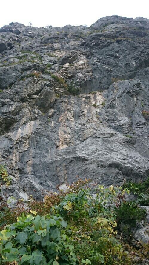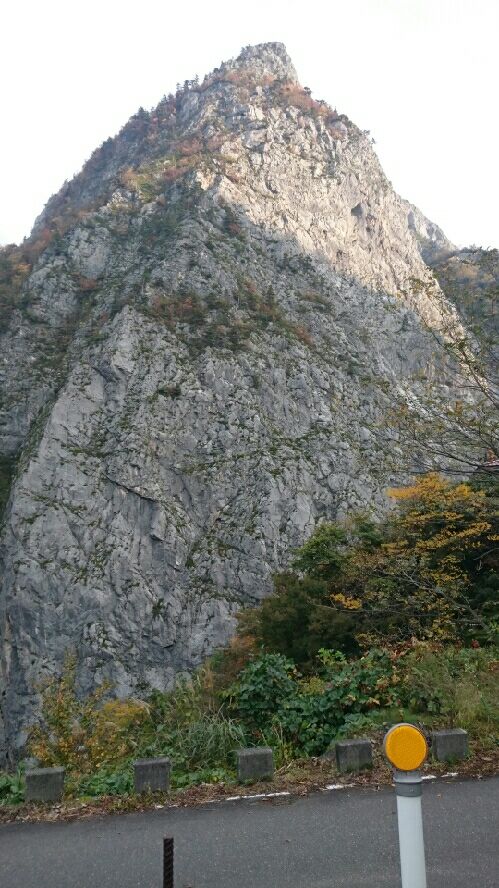 10月23日明星山南壁マニュフェストを無事登攀し、2年前に敗退した雪辱を果たすことができた。このルートが今季の目標だったので登攀内容はともかくとして素直に嬉しい。ひとつ課題が終わった。明星山付近の天候がめまぐるしく変化していたため、土日だった予定を変更して急遽22日の仕事終了後、北陸新幹線に飛び乗り糸魚川で前泊。当日は昨日の雨がどれだけ乾いているか心配なので遅めの朝7時に出発。駐車場に到着して明星山を目の当たりにしたら思いの外乾いていて安堵した。これなら行ける。 朝日が当たる明星山 (駐車場より)前回は取りつきに着くまでにチロリアンブリッジがあったが今回はロープが撤去されており、小滝川の浅瀬を裸足で渡った。取りつきに着いて改めてこれを昇りたいが為にトレーニングしてきたんだ、必ず昇ると心に言い聞かせる。クライマーは誰もいなくてマニュフェスト貸切、天気は一日中安定した晴天、時折風が渡って気持ち良く最高のコンディションで昇れた。 8時30分草つきから始まる第1Pを順調に昇り始めたのはよかったが、カムの処理と回収に時間がかかってロスタイム、最初からやる気満々の気持通りには運ばずかなり意気消沈。でも私はこの程度なんだから力まず落ち着いてゆこうとかえって肩の力が抜けて冷静になった。問題は2P目(5.10b)だった。前回このハングを乗り越すのに手間取って結局敗退せざるを得なかった経緯がある。ところが今回は自然に昇って苦労せず手間取らず乗り越せてしまった。これは幸先がよい。更にそれを越えた後もけっこう悪かった記憶が残っていたが全く気にならなかった。すっかり嬉しくなる。次々に3ピッチから7ピッチまで順調にこなして下部城砦から上部城砦を過ぎ、行く手に険悪な様相の岩が見えてきた。8Pの鷹巣ハングだ。そこにたどり着くまでがものすごく大変そう。洞窟に向かって凹状フェースを詰めるがつるつるの垂壁でとても難しくて落ちそう。思わずA0してしまった。 やっとハングの洞窟に這いずり上がったがそこからは別の意味で怖かった。グレードは5.9で低いのにその洞窟内部と外の景観に圧倒された。垂直の白っぽい崖を洞窟の天井まで上がり、クラックに手を入れるとしっかりしていて安心。足の位置も重要なのに下のスタンスに足が届かないので体を縮めて洞窟天井に頭をこすりつけるように接触させてトラバースしたらヘルメットがカリカリとひずむ音がしてやばかった。どうにか外にでるとこれまた更に怖い。左にしっかりしたホールドがあるので大丈夫なのだが、なんというすさまじい高度感と露出感!!ここで落ちたら絶対ダメ、終わりという岩状だった。9ピッチ目、慎重に慎重を重ね右状クラックを昇って遂に13時10分終了点到着した。 鷹巣ハング 洞窟から外へ やったね!! 山頂 終了点からの景色は素晴らしかった。翡翠色の小滝川がはるか下に清らかに流れ、川の底から対岸の山頂まで一面の紅葉、そこを区切るように道路が走っている。行動食を一口食べて懸垂下降にかかる。空中懸垂が何度あり、豪快な空中遊泳を楽しんで懸垂下降6回位で地上に降り立った。地面に立つって何という安定感なんだ!。生還した。 懸垂下降参考タイム 駐車場7:30→取りつき8:10→登攀開始8:30→終了点13:10→懸垂下降開始13:30→取りつき15:10→駐車場15:50