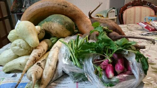 山に出かけている間に義妹夫婦がわが家を訪れてくれていた。前日に来訪を知らされてはいたが既に予定が決まっていたので留守をして失礼していた。今日帰宅してみたら、たくさんの品々が玄関に置かれていて驚いた。まず義妹夫婦の育てた無農薬野菜が段ボールに一箱。葉付き大根、おいしそうなサツマイモ、隼人瓜、インゲン豆、ラディッシュ、初めてみたつる首カボチャというひょうたんが曲がったような形をした珍しいカボチャなどが入っていた。更にサツマイモの葉、紫蘇の葉、桑の葉、菊芋の葉と茎を乾燥させたものがビニール袋に一袋、それに加えてポピー、牛久の希望という名の菊、ウツボ草、白菜、サニーレタスの苗が発砲スチロールに一箱。 無農薬野菜がどっさり 乾燥植物 花と野菜の苗私は義妹一家に迷惑をかけることはあっても役にたつようなことは全くしていないのに、こうしていつも気を遣って頂いて本当に恐縮してしまう。何て有難いことだろう。今回は新たに花と野菜の苗まで頂いた。枯らさずにしっかり育てなくちゃ。乾燥植物は漢方薬の素だと考えて時間があるときに漢方薬茶にしよう。前に頂いて自分で作った冬瓜の種もあるからそれも加えて。