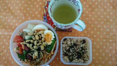 登山の翌日は必ず仕事に出て行く。出勤すると多少は歩くので重労働後の一種の積極的休養の位置づけだ。今日は膝の痛みは和らいだが下半身が酷い筋肉痛で階段を下るのが辛い。学校なので給食を取ることも可能だがいつもお弁当を持参している。と言ってもたいしたことはせず、自宅にあるものをちょこちょこと誂え、タッパーに詰めていくだけの超手抜き弁当だ。ところがその私のお弁当に興味がある女の子がいる。「今日はなあに?」とその子は自分が給食を食べに行く前に必ず私のお弁当を見たがる。隠す必要もないし見栄を張る必要もないので毎日見せている。今日はついでに写真も撮った。というわけで今日のお弁当です。 ・エリンギ・トマト・ゴボウ・人参・大葉のサラダ エゴマオイルとニンニク酢の手作りドレッシング ・ひじきと大豆の煮物 ・ゆで玉子 ・小豆入り玄米ごはん ・昆布茶