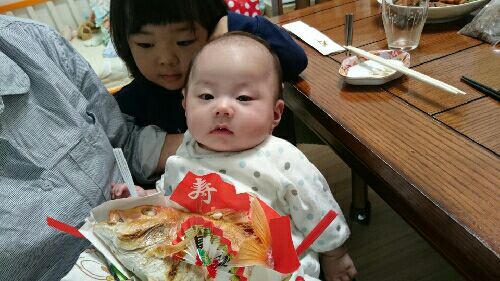 日曜日に三番目の孫・結ちゃんのお食い初めがあり、都内の娘宅に出向いた。 尾頭付きの鯛にお赤飯、海老やタコの盛り合わせやちらし寿司、煮物、青菜のお浸しなどお取り寄せと娘のお手製の料理が並ぶ。私が最年長だということで鯛を結ちゃんのちっちゃな口に持っていって食べる真似をする。一生食べ物に困らない生活ができますようにと願をこめて。主役の結ちゃんはおとなしくお利口だったが、上の葵と翔君はパワー全開、リビングを走り回っていた。特に翔君、入り口からリビングの端までフローリングで一直線10m位あるだろうか、そこを全く休むことなく何度も何度も走っているのには驚いた。葵は少し女の子らしくなっていた。活気に満ちてとても楽しかったが疲れた。もう翔君のパワーにはついていけない。 剱を構えてニンニンジャー!!