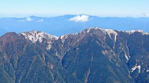 北岳山頂で360度の眺望を満喫し、12時半頃下山開始。実はここからが私にとっての核心だった。膝が悪い状態での登山なので山頂で右膝にサポーターを巻いた。山頂からしばらくは岩の多い急斜面で慎重に下るがそのうち、案の定膝がきしみ始めた。激痛ではないのでそのまま下る。しばらくすると緑の屋根の肩の小屋が見えてくる。大きな小屋だ。さらに下る。目と同じ高さだった甲斐駒や鳳凰三山がすこしずつ上に見えるようになってくる。 鳳凰三山 オベリスクがはっきり見える更に傾斜がゆるくなり、岩も少なくなってくるのだが、この北岳山頂(3192m)から白根御池小屋(2230m)まではけっこう長い。とくに白根御池が眼下に遠く見えるようになってからが遠い!!。なまじ見えるだけに余計遠さを感じる。ダケカンバの黄葉を眺めながらやっとのこと御池小屋まで下山。1時半だった。ここで小屋特製のケーキセットを賞味。カフェイン切れになっていたのでおいしいドリップ珈琲が飲みたかったのだ。 至福の時間を過ごして2時に広河原(1522m)に向かって最終下山開始。ここからも長かった。膝はますますシクシクし、腿もだるくなって歩く速度が落ちたのを自分でも実感した。早く歩くのはもう諦め、登ってくる登山者とすれ違って立ち話などし、紅葉も観てゆっくり下った。大体私は行動時間が10時間過ぎるとスタミナ切れする。チンネや剱尾根など13時間コースでも最後が辛かった。その上ここでは膝の痛みが加わりもうヨチヨチ歩きだ。何とかしのいで広河原に着いたのは3時40分頃だった。乗り合いタクシーの4時10分には余裕があったけどちょっと情けなかった。昨日2時間ジャストで登ったあの急坂を下りになっても20分しか短縮できてない。でも仕方ないか。標高差でみると昨日は登りだけで708m、今日は登り962m、下り1620mで標高差2732m、2日間で累積標高差3440m!!これは無理だ!!数字にしてみると高齢者の膝にはきつすぎた。広河原から乗り合いタクシーで芦安に出、さらに韮崎からスーパーあずさに乗って帰宅する頃はもう左足を引きづりながら歩いていた。でも無事完了して嬉しかった。