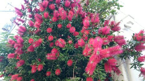 ここのところ、ブラシの木が目に付く。一度目は用事で出かけた世田谷の通りで。すごく花付きがよくて色が奇麗だったので思わず写真を撮った。二度目は谷津バラ園で見た。谷津バラ園にはバラだけではなく、ハンカチの木、スモークツリー、ヒマラヤ桜、ジャカランダなど珍しい木の花がある。 世田谷のブラシの木でもこの木はまだまだ珍しくて限定された場所にしかないと思っていたら、そうでもなかった、ご近所に近年植えたばかりのようなブラシの木を二か所で発見した。昨年まではこのお宅にブラシの木は無かった!!。. ご近所のブラシの木の花を近くでじっくり見ると何と花の先から枝が出ている。花を枝が串刺しにしてまるで団子の串刺しのようだ。とっても面白い。このユニークさと見栄えの良さで植える人が益々増えるだろう。でも強烈な個性の花だから我が家のような狭い場所には向かないだろうな。