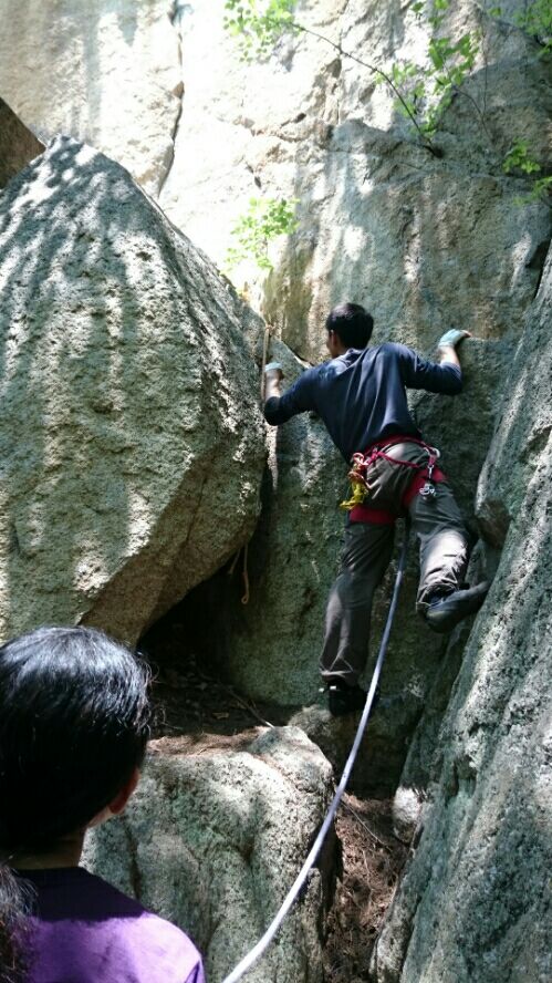 5月1日最終日は小豆島インスボンと呼ばれる岩場にマルチに行った。韓国に本物のインスボンという立派な岩場があるのだが、小豆島のこの岩場がまるで韓国のインスボンそっくりなので一般的にこう呼ばれている。道路からその全容がよく見えるのに取りつきへの道がまるでわからずというより無く、またしても取りつき核心になった。ここはサルトリイバラが多生していたのでそのバラに何度も刺されて苛立ちがつのった。道なき道をヤブ漕ぎしてやっと取りつきに到着。3日間で思ったことは小豆島はクライマーが全くいないので静かで岩場貸し切り状態で良かったが、昇る人が無い分、道の踏み跡が消されて道がわからない状態になっているということだ。ポップアップというルートを昇った。 小豆島インスボン外観も岩質も韓国インスボンとそっくり。岩肌がざらざらして目が粗いスラブでフリクションがよく効き、快適な2ピッチのマルイチが楽しめた。 1ピッチ目終わりのテラスで 美しい瀬戸内海