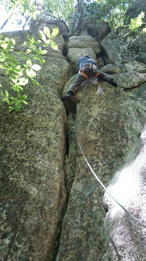 5月23日いよいよ佐藤裕介さんと瑞牆山でクラッククライミングのトレーニングに入った。瑞牆山荘前から車で少し移動し新緑溢れる樹林帯を15分ほど歩くと熊の岩というゲレンデに到着。ほどほどの長さのクラックがあちこちに走っている。参加者は3名、旧知のTさんと京都から見えたNさんである。足の入れ方から教えてもらい、一人ずつ昇りながら個別のアドバイスを頂いた。クラックは技術なので知ると知らないとではものすごい違いである。腕のねじり方、立ち込み方などとても勉強になった。TさんもNさんも上手でスイスイ昇り、私だけが「昇れないよぉ」と悲鳴を上げていたのだった。 佐藤さんのクライミングはとにかく速い、身のこなしが軽い。何の困難もなく自然に上昇する姿を見ていると自分も昇れるような気分になるのだが、実際に現場に行ってみると下から見るのと目の前で見るのとではまず岩の大きさが違う、かぶりを受けるなど現実問題が振りかかって思うようには昇れない。私の改善点はクラックに入れた足にしっかり立ち込むこと、腰を入れて伸ばすことなどいろいろあった。上手くはいかなかったけど今日も学ぶ喜びを感じた。