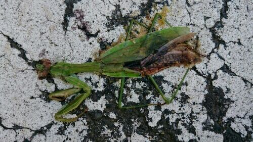 11月3日散歩していたらアスファルトの上に完全に潰されて薄くなっているカマキリを見つけた。胴体や羽、手足はまだ綺麗な緑色だがハラワタは飛び出していた。無残この上ない姿になってはいたが、手の形、脚の折り曲げ方など形が整っているのでまるで整枝した押し花のようで不潔感や嫌悪感は無かった。ホント、緑色の押し花だった。このカマキリは一体こんなところで何をしていたのか。温かいのでアスファルトの上を無防備に歩いて自転車かバイクに曳かれてしまったのだろうか。8月には蝉もかなり無残な姿になっていたが、晩秋にはカマキリも受難だ。じっとこの画像を見ているうちに完膚なきまでに薄く圧縮されてしまったこのカマキリに自分と娘の姿が重なってしまった。ああ、駄目だ。こんなこと考えているようでは!!。