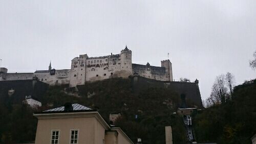 ザルツブルグ2日目は朝から冷たい雨が降りしきっていたが、恐れたほど寒くなくてほっとした。今日はまずホーエンザルツブルグ城へ。昨日行く予定だったのにエレベーターの点検日で行けなかったのだ。 今日はエレベーターが運航しているので城塞まであっという間に着いてそこから見える山は雪山!!。正に八ヶ岳だった。下から仰ぎ見るよりはるかに巨大な城塞だった。 城のあちこちに金色の☆をかたどったオブジェのようなものが吊るしてあって華やかだった。キリストが誕生した時、東方の三博士が供物を持って生誕を祝ったという聖書の故事による星形だろうか。城塞から街並みが手に取るように見えた。こじんまりしているが、真ん中にエメラルド色の川が緩やかに流れていて大聖堂や教会の尖塔に住居などが入り混じって高低差とメリハリがついていて、とても美しい街だった。城塞の中に入って見学した。多種多様な展示が膨大数あってじっくり見てたらどれだけ時間がかかるかわからないほどだった。戦争や武器の展示も多かったが、大司教の居間だったという黄金の間がすごかった。こんな山の上ににこんな華美豪勢な部屋を造るなんてどれだけの富を抱えていたのだろう!!。広間は権勢を誇った大司教が祝祭典や饗宴を催した部屋で、現在ではグランドピアノが設置されていて城塞コンサートが開催されている。存在感のある4本の大理石のらせんの柱が壁に沿って並んでいるほか、金メッキの鋲をちりばめたブルーの天井は星空のようで、独特の空間になっていた。寒いからだろう。あちこちに巨大な陶器製のストーブがあった。ストーブというイメージは全くなく陶器の芸術品に見えた。 大司教黄金の小部屋 城塞コンサートが行われる広間