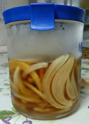 かねてよりヘモグロビンA1Cが高めで気になっている。何かの検査を受けた時についでに計った血糖値が高くて糖尿病境界型と言われたのは35歳くらいの時だった。それからもう30年以上過ぎてるからヘモグロビンA1Cが高くてもおかしくはない。というよりこの年まで糖尿病にもならずよくキープしてきたと考えた方がよい。でもさすがに最近は高めに推移しているのでこれを何とか改善しないと本当に糖尿病になり、合併症を発症したりして将来酷い目に遭う、それだけは避けたいと思っていた所へ黒酢玉ねぎが血糖値改善に効果的と書いてあったので早速作ってみた。作り方は簡単。玉ねぎ2個をスライスして15分程度空気に触れさせ、あとは密閉容器に入れて黒酢をひたひたに入れて一晩おくだけだ。 一日置いて食べてみた。酸っぱいけど黒酢なのでツーンとくるきつさは無く、美味しく食べられた。1日で50グラム程度を食べるといいそうだ。早速毎日サラダに加えて食べている。本当に効果的かどうかわからないけどできることは何でもやってみよう。
