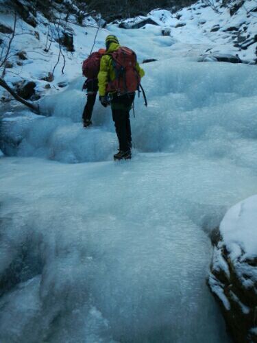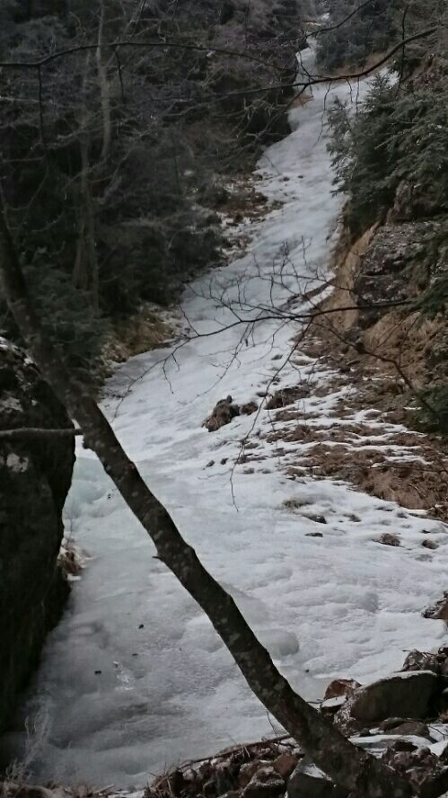 1月4日今日は広河原沢右股にアイスクライミングに出かけた。当初の計画では三叉峰ルンゼだったのだが稜線は強風で吹き飛ばされるという予報で、ルート変更した。朝5時半赤岳山荘を車で出発し、舟山十字路方面へ出て、駐車場から登山開始。傾斜は緩いがどこまでも続く坂道をじくじくと登り詰めて二股、そこからは登山道になって雪がどんどん出てきた。川底が見事に凍って波の形そのままの氷を踏み抜かないように登っていく。何段もの層を形成して見事に凍っている。途中短い滑滝が出てきてそれをアックスで超えながら氷結した沢を詰めてまずは武藤返しの滝に着いた。ここまで3時間くらいかかってアプローチが予想以上に長かった。武藤返しの滝という変わったネーミングは初登しに来た武藤さんが登れなかったのでこの名前がついたとか聞いた。でも近辺にはクリスマスルンゼ、ポストクリスマスルンゼなどクリスマスにちなんだネーミングだからもうちょっと洒落た名前はつけられなかったものか。 小さな滝を超えて武藤返しの滝は予想より小さくこじんまりしていた。ここだけなのでトップロープで登って楽しんだ。 武藤返しの滝から一旦下って少し隣の沢を登ると本日のメインクリスマスルンゼに出た。ここは予想より大きくて二段になっていて立派だった。下部は緩いが上部は立ってバーチカルだ。 二段になっているので2ピッチで昇った。上部は立っているので難しいかなと思ったが、段だんになっている部分がけっこうあって特に困難はなかった。氷結状態がとてもよくアックスもよくささり快適だった。ガイドのMさんによると年末頃より今の方が氷結が良くてベストだろうとのことだった。本来ならここはクリスマスに計画していたが、悪天で中止した(代案の大菩薩で酷い目にあったが)ことを考えると良いコンディションで昇れたのでラッキーだった。この日は動いていない時はガタガタ震えるくらい寒かった。峰の上のほうは予報通りの強風が吹き抜けていてクライミングしている間はずっと曇り空だった。この隣にポストクリスマスルンゼの取りつきが見えていたので昇りたかったが、時間的に厳しかったので次の機会を待つことにした。 ポストクリスマスルンゼ 長大な滑滝から始まる登攀を終了して、下山開始。これがけっこう長かった。二股出合、二股からさらに林道歩きでうんざりしたが、山麓は青空が見え、日の光が降り注いでいた。要するに沢だから寒かったんだ。二日間の楽しいアイスクライミング初めが無事終了した。
