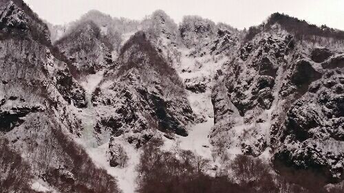 1月25日雷電海岸3日目。今日は4ルンゼを昇った。駐車場からくっきりと4ルンゼの大きな氷瀑が見える。しかしその取りつきに到着するまでが私の核心だった。雪が深く靴が潜り込むのでアイゼンではなくMSRを穿いて雪道を登るのだが、実は私はこれが大の苦手なのだ。言い訳だけど、MSRの幅と長さが小さく短い私の歩幅と合わず、しょっちゅう干渉しあってスムーズに歩けない。そのため、今日は最初からアイゼンを穿いて出発したが、もう白い蟻地獄に落ちたも同然の大変さだった。他に登っている人はいないのでいつもラッセルで登るのだが、雪を踏むと靴がズズッと沈みこんでしまう。何とか沈み込まない場所を検討つけて足を上げるのだが、二歩目もズズーンと沈む。すごい無力感!!。これを何度も繰り返してさすがに辛く、不満を言いたかったが、誰に不満を言おう。自分が望んできた旅ではないか。辛抱して、一歩下がって二歩進むではなく、二歩下がって一歩上がるを累々と繰り返してやっと取りつきに到着した。さすがにガイドも気の毒がってくれた。ガイドはMSRで豪快に上昇していく。ブルドーザーと軽自動車の差に思えた。 雷電海岸 4ルンゼ 4ルンゼは遠目で見てもかなり幅も高さもある立派な氷瀑である。気を取り直して登攀開始。特に技術的困難はないが、何しろ長い。持久力を試された。 私はアックスを打ち込むのはけっこううまくできるだが、足の蹴り込みが弱い気がする。前爪がしっかり氷を捉えていない状態でムーブを変えて滑ったことがあった。「打つ」「蹴る」と言いながら一歩一歩上昇していった。細い首状の氷を超えて2ピッチ目の上の段に上がりきった所から先が長かったがここは特に困難はなかった。終了点から今日も日本海を眺めた。モノトーンの世界が広がっていた。 日本海