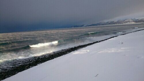 1月24日雷電海岸二日目。朝からテレビで今日は酷寒日であることを何度も予報している。道内の占冠町では最低気温-32度らしいが、ここ岩内町は最高気温マイナス2度らしい。そんな寒さの中で氷瀑を昇るのも正気の沙汰ではないような気もするが、ここまで来て引くわけにもいかない。朝8時、雪が降るなかを車で出発。あまりの寒さに海岸ではけあらしと呼ばれる特殊な現象が見られた・ けあらしの海今日は1ルンゼを昇った。雷電海岸は今日も私たち以外には人の姿はなかった。小一時間雪のルンゼを詰めて取りつきに到着した。1ルンゼは4ピッチである。でもスタートが10時頃で早いからゆっくりと昇れる。1ピッチ目はかなり長かったが特に困難な部分はなく、順調に昇る。2ピッチ目は急な雪壁が多く、氷瀑部分は少なかったが特に問題なし。困難はその先3・4ピッチ目にあった。ここは 短いバーチカルでバーチそのものは大丈夫なのだが、上からの スノーシャワーが激しく降り注いできてもう目を開けてられない。頭、腕、上半身と雪まみれで寒さのため、顔が凍りそうだった。シャワーが通り過ぎるのを待っていたが、次々とスノーシャワーが襲ってくる。それも完璧な垂直アイスを昇っている時にである。待っていたらますます体が冷えて動けなくなると思い、あまり見えない中で手探りで上へ上へとアイスアックスを打ち込み、見えない中でアイゼンを氷に蹴り込んだ。苦闘している間にシャワーが一段落し、目が開けられるようになり、その後は順調に昇って3ピッチ目を終了。が、ホッとしたのも束の間、4ピッチ目になると高度が上がったこともあって、強風が吹き突ける。寒くて震えあがった。アイスアックスのグリップに雪が着いても通常は溶けるのだが、あまりの寒さでグリップに付着したままで凍結してしまう。更に手袋も雪が着いても指の温かさがあれば溶けるのだが指も冷えているのでこちらも付着したまま。結局グリップも手袋も凍結気味で指の温度を著しく奪われてしまい、辛い登攀になった。 1ルンゼ 4ピッチの登攀] やっと終了点に到着し、灌木でビレイ。一息ついて眼下の日本海を眺める。今日は更に寒さが広がる日本海の風景が広がっていた。でも海を見ると何となく心が落ち着いた。下降は懸垂三回で取りつきに降り立った。まだ2時半位で早く終了した。一刻も早く宿に戻って温泉に入って体を温めたかった。 白波打ち寄せる日本海