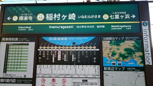 鎌倉ハイキングは江ノ電長谷駅で終了したが、ここで江ノ電に乗ってみようと思いついた。鎌倉には何度も来ているのだが実は江の島電鉄に乗ったことがない。この機会に乗っちゃえという軽いノリで長谷駅から緑色の江ノ電に乗った。行先は稲村ケ崎だ。昔、小学校で ♫ 七里ガ浜の磯伝い 稲村ケ崎 名将の剣投ぜし 古戦場 ♫という歌を習ったことがあり、その稲村ケ崎とやらを実際に見たくなったのだ。 江ノ電は緑色の小さな車両で4両編成だった。電車は道と接近している狭い軌道をすり抜けるように巧みに走って稲村ケ崎に着いた。下車して踏切を渡ると目の前にすぐ海が広がっていた。稲村ケ崎だ!!。緑の江の島もこんもりと見える。その右側に富士山がかろうじて秀麗な山容を浮かばせている。 公園の芝生の中に史跡稲村ケ崎新田義貞渡渉伝説地という碑があった。新田義貞が鎌倉を攻める時、稲村ケ崎の海の中に黄金の剣を投じると海が割れて鎌倉を攻め落とせたという。何となくモーゼの紅海伝説と似ている気がしないでもない。史跡とは言っても真っ青な海が広がるだけで、いにしえにそんなことがあったなんて信じる手がかりが全く見つからず、しばし呆然と海を眺めた。新田義貞よりもインパクトがあったのは江の島で遭難した逗子開成中ボート部の像だった。高校時代に修学旅行で関東に来た時のバスの中でこの「真白き富士の嶺」をガイドさんから習ったので今でもこの歌が歌える。その後50年余を経て思いもよらずその現場に遭遇したのだった。歌詞と目の前の風景がマッチして単なる歌に過ぎなかった遭難が現実味を帯びてきた。二人の少年像も迫力あってこの悲劇の雰囲気をよく伝えていた。 真白き富士の嶺(七里ガ浜哀歌)の像♫~真白き富士の嶺 みどりの江の島 仰ぎ見るも、今は涙 歸らぬ十二の雄々しきみたまに 捧げまつる 胸と心 ~♫