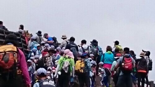 7月22日朝4時起床。と言っても一晩中うつらうつら状態だったのだが4時に体を起こした。もう3時半頃から小屋の外では人の話し声が聞こえていてざわついていた。夜間登山者が到着し、寒いので温かい料理を注文したり話をしたりするのだ。身支度をして小屋の入口広間に出るともう登山者で一杯!!。私も月見うどんを注文して食べ、準備をしている内に日の出時刻4時40分頃になった。小屋前には沢山の人が場所を取ってひしめき合いご来迎を待っている。私はご来光にそこまでの執着はないのでずんずん登って朝日岳の近くまで行って人と人の隙間に場所を取って東の空を見つめた。 ご来光を待つ人々今日も素晴らしいご来光を見ることができた。外国人の皆さんが興奮していたのが目立った。外国にもご来光思想はあるのだろうか。頂上小屋から万歳三唱を促す放送が流れ、みんな「万歳、万歳」と叫んでいた。 私は1回目のお鉢巡りをするため、富士宮口方面を登っていった。おなじみのルートを重い体をゆっくりゆっくり運んで剣が峰に到着した。所が既に剣が峰前に撮影待ちの数十メートルの行列ができていたのには驚いた。仕方なく行列に並んで1回目の写真を撮ってもらった。天気が良く青空が気持ちよかった。 日本最高峰富士山剣が峰 3776mお鉢巡りルートも結構人が続いていたが、マイペースでじっくり歩いた。南側の白山岳の稜線まで来ると影富士ができていて見事な三角形の影が地上に投影していた。影富士とは富士山自身の姿が日の出と反対側の雲海や地表に投影することでこれはいつでも見られるというものではないのでラッキーだった。前回見たのは45年ほど前で初めて富士山に登った時24歳のことだった。 富士山の影が地上に投影している影富士こうして1回目鉢巡りを終了。小屋前で一休みして2回目をクリア。剣が峰の行列はまだまだ続いていたが、並ぶのはもう嫌なのでその先の岩の上で撮影した。ここなら行列しなくてもすぐ写真が撮れるのだがやはり皆さん、3776mの碑が必要なのだ。 2回目剣が峰いつも同じ道だと変化がないので中央火口の中に入って金名水を見学した。 金名水3回目は逆回りにルートを変更。富士登山にしてもお鉢巡りにしても一木一草ない赤茶けた火山礫の道を歩き、景色も変化がないので飽きてしまう。ただ逆回りにすると視点が変わるのでちょっと変化がつく。富士宮口には富士山頂浅間大社奥宮が白い鳥居の奥に鎮座ましましていた。こちらが本家だ。隣には夏季限定の富士山頂郵便局も開局していた。 富士山頂浅間大社奥宮 富士山郵便局3度目のお鉢巡りを終えて山口屋に戻り、一休み。もう1回しようかどうしようかと迷った。相当飽きていてモティベーションが上がらなかった。もう下山しようと決断。残った食糧をたくさん食べて下山にかかった。前回は時期的に早かったので8合目から下山道に入ったが、今回は山頂からすぐ下山道に入った。実はこの下山道が大嫌いなのだった。ブルドーザーが上り下りする広い道に火山礫をザクザク踏んで下山する。急勾配なので嫌でも足が前に出て早く歩くことになる。足元が不安定な所を早く下るので足に負担がかかるし、不愉快だ。でも最盛期のこの時期、下からたくさんの登山者が登ってくる登山道を下ることも迷惑だろう。止む無く頑張って下った。途中で雨が降ってきて午後は不安定な天気に変わっていた。下山した五合目は土曜日とあっていつも以上に賑わっていた。無事2回の富士山トレーニングをやり終えてホットした。高速バスを予約した3時出発から2時に出発に変更して1時間早く帰京した。到着した新宿はめちゃくちゃ暑いし、人の波・波・波。現実に戻った。参考タイム お鉢巡り5:00~3回→9:50 頂上山口屋10:30→五合目13:30→14:00高速バス→新宿