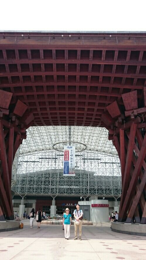 7月28日ずっと訪ねてみたいと思っていた街№1の金沢を息子と二人で訪ねた。ご存知のように私はしょっちゅう国内外の山に出かけてしまい、その留守は主に息子が守ってくれている。今回は息子の慰労もかねて北陸地方二日の旅に出たのだ。初日は金沢市内巡りで兼六園、金沢城、21世紀美術館を訪ね、近江町市場で新鮮な海鮮の夕食を楽しんだ。駅から東口に出るとまず巨大なもてなしドームに圧倒される。雨や雪の多い金沢で「駅を降りた人に傘を差し出すもてなしの心」を表現したドームと聞く。3,019枚ものガラスを使用し、金沢の玄関口に明るく雨にもぬれない広場を作り出している。ほとんどの部分はモダンな鉄骨で組んであるが、先端だけが巨大な木材で組んであって、これは金沢の伝統芸能である加賀宝生の鼓をイメージした2脚の柱に緩やかな曲面を描く屋根をかけたもの。伝統と革新が共存する街である金沢をイメージさせる鼓型の門で鼓門。納得した。 もてなしドーム 2本の鼓型の門と屋根の鼓門鼓門の周辺では沢山の人々が休んだり話したりして寛いでいた。とにかく広々していて解放感に溢れるのが気持ちよい。辰巳用水から水を引いた噴水を見た後、駅前からバスに乗って兼六園に行った。ここも壮大で素晴らしく90分ほどかけてゆっくり庭園内を見て回った。時期的に緑一色だったが、冬の雪吊りや紅葉の時期はさぞかし素晴らしいだろう。とても暑かったので氷を食べて童心に返った。兼六園を出るとすぐ隣に金沢城の石川門が見えるのでそちらに足を伸ばした。加賀前田藩百万石の経済力や権勢を如実に物語る建築物ばかりで凄かった。 金沢城から歩いて21世紀美術館へ行き、最後は近江町市場で海鮮丼を食べた。海鮮が山盛りで超ボリュームがあった。当分の間、刺身は食べたくない気分になった。