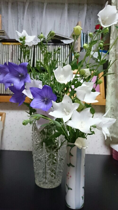 ずっと桔梗は秋の花だと思っていた。秋の風情がとても似合うからであろう。でも実際は桔梗の花は夏に咲く。そう、今、桔梗の花が真っ盛りである。色も紫だけだと思い込んでいたが、白や薄いピンクのものも咲いている。今日はたくさん咲きすぎたから自由に切ってよいと言われたので、桔梗をもらってきた。水揚げが悪いのでしばらく冷水の中に泳がせ、思い切って茎を短く切って水が揚がるようにした。白い桔梗の花は涼やかで室内が落ち着いて和風の雰囲気になる。ついでにトイレにも活けた。 白と紫の桔梗 トイレの一輪挿し 以前作った桔梗の押し花