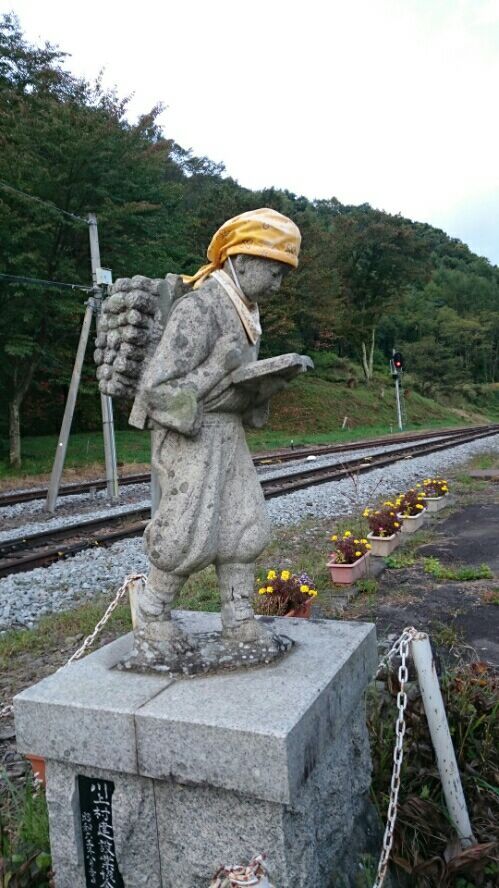 小川山から帰る時は信濃川上駅から小海線に乗る。小さな駅舎にはこの駅で撮影された吉永小百合さんの大人の休日クラブの大きなパネルが飾られている。駅構内には二宮金次郎の銅像もある。頭の被り物が季節のよって変わるのだが今回は黄色のバンダナになっていた。駅舎の外には秋の花が咲き乱れていて、感じがよい。 遅い時間だったので乗客も少なく、のんびりと揺られていたらドシンという音と振動がして電車が急停車した。何だろうと思っていたら運転者さんが「鹿と衝突しました。安全を確認してきますのでお待ちください」と言って懐中電灯を持って出ていった。線路点検をしているのだろう、かなり長い間待たされた。やっと電車に戻ったら「線路に異常はありませんでした。お客様で怪我をされた方はいらっしゃいませんか?」と車内を見渡し、これも異常なしだったので発車した。小海線の駅はほとんどが無人駅で、この電車も運転手さん一人で運転も切符管理も安全管理もしているので、こういう時は時間がかかる。小淵沢からのスーパーアズサの乗り継ぎに間に合うか気がせいたが、アズサも遅れてきたので間に合った。それにしても鹿と電車の衝突なんてやはり日本一高い標高の山岳路線ならでのハプニングだ。