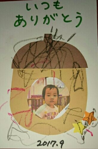 9月22日今日は朝は陽が射していたし夕方6時から雨という予報だったのでマットや洗濯物を出して出勤したら、昼前から雨が降り始めて焦った。三人目の孫・結ちゃんからも敬老ハガキが届いた。彼女は今年度、姉兄の通所している保育所に入れず、一人だけ別の保育所にお世話になっているので、上の二人と同時に届かなかったのだ。どこの保育所でも同じ活動をさせていることがよく分かった。 結ちゃんのハガキ 叔父さんにホールドされてポーズ先日会った時より表情がしっかりしている。この子は誰に似ているのかわからなかったが、この写真を見ると父親に似ていると思った。