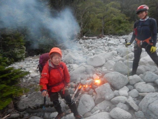 兎平は近くを黒部川が音をたてて流れ、樹林帯側には灌木が茂っている比較的広い河原だった。川床に石がゴロゴロ散らばっているので、まず整地から始めた。大きな石を全部運んで平らな地面にしてタープを張った。 黒部川 奥の廊下の岩魚釣り風景 焚火をして体を温める タープの中はストックを2本繋ぎ合わせて心棒にしている。地面の上に1枚敷物を敷き、その上にマットを置いてシュラフで寝る。とてもシンプルな作りだがこの時期には十分だ。 次は焚火だ。渕の深い所で胸まで水に浸かった私の衣類は水浸しだったのでとりあえず濡れた衣類をすべて脱ぎ、持ってきた全ての乾いた衣類に着替えた。すごく寒くて寒くて震える位だったのでダウンを着た上に雨具を重ねて着、背中にホッカイロまで張った。スープを作ってもらって飲み、ワインも頂いて少し体が温まって落ち着いた所で串刺しにした岩魚を焚火の周りで焼いたのを頂いた。天然物で自分たちの手で釣り上げた岩魚の塩焼きは噛み応えがあってとても美味しかった。 焚火は人の体も心も温めてくれるKガイドと同行のTさんの3人で焚火を囲み、黒部川の流れる音に耳を澄ませた。不思議なくらい満ち足りた気持ちだった。空には月が昇り、人工物は何もなく、心から寛ぎ、至福の時が流れた。幸運なことにこの夜は冷え込まなかったので温かく眠れた。