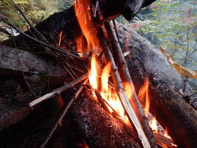 大町の宿に到着したのが11時45分。それからすることがない。しなくちゃならないことがない!!これこそが人生における至福の時間だ。精一杯ぼんやりして無為に過ごそう。テレビもPCもなくスマホも入らないというのが良い。こんなに長時間暇になることはめったにない。焚火の枝を集めに行ったり、大木の葉の隙間から入る日の光と空を見つめたりしてしながら、Kガイドと本の話、映画の話で盛り上がった。夕方4時から焚火を始めた。焚火はどういうわけか心を温めてくれる。無心に橙色の炎を見ているだけで穏やかな気持ちになる。 今夜の夕食はKガイドお得意のガーリックライスと焼きそば。ラードをたっぷり使って炒めるからコクがあって美味しい。食後にはデザートのコーヒーゼリー。こんな山奥でコーヒーゼリーが食べられるなんて幸せ。何より上げ膳に据え膳、自分は食べるだけというのがまた贅沢この上ない。ワインを呑みながら緊張をほぐして眠りやすいようにする。6時過ぎに就寝。地面にマットを敷きその上でシュラフに入る。何と言う開放感!!。自然に包まれて寝るという感じだった。寒いのではないかと思い、ダウン上下にホッカイロ、もっと寒い時にはプラティパスにお湯を入れて抱いて寝ると用心してきたが、あまり寒くなくて快適に過ごせた。漆黒の闇にはならず灰色の空がずっと見えていた。岩小屋のせいか苔の匂いのようでもあり岩の匂いかもしれないような古色蒼然とした独特の匂いがした。