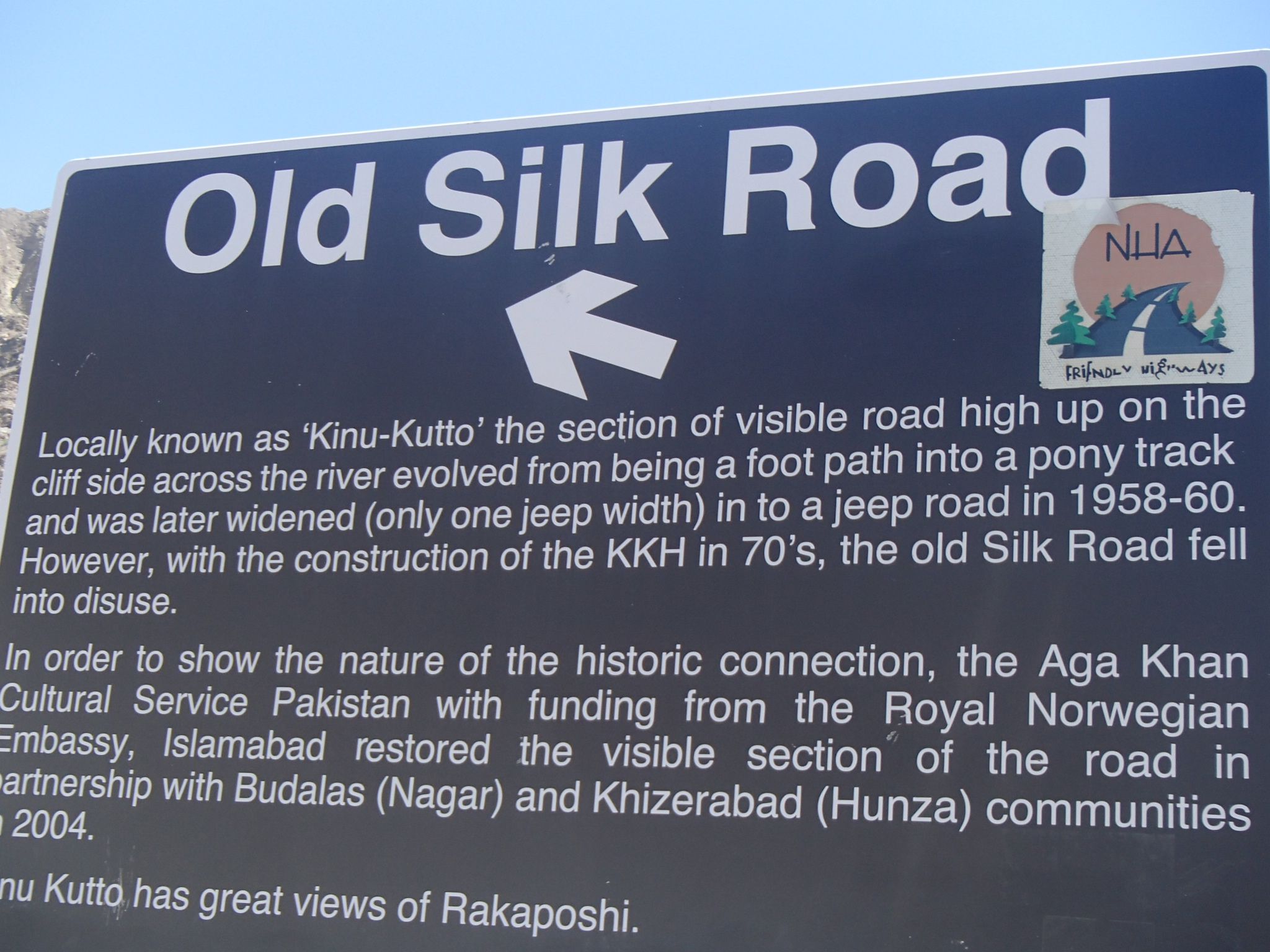 カラコルムハイウエー(KHH)を北上してギルギットの手前でギルギット川から離れ、フンザ川沿いに走っていく。しばらくするとオールドシルクが見れる地点に出た。そこには茶褐色の急峻な山の斜面に動物一匹がやっと通れる程度の細い道というより踏み跡が鋭角的に続いている。 説明版KHHはパキスタンおよび中国政府により建設され、建設開始から20年が経過した1978年に完成した。多くのパキスタン人および中国人労働者が、建設中の地滑りや転落事故で死亡した。KHHは古代のシルクロードをなぞっていて中国とパキスタンにとって、経済 ・軍事面でとても重要な現代のシルクロードとも言える大動脈である。古の昔、三蔵法師も 歩いたというオールドシルクロードに胸がジーンとなった。かなり高い位置にあるから細い道を踏み外して川に転落したり怪我したりということもあっただろうな。 オールドシルクロードシルクロードというと平山郁夫画伯のラクダが月夜の砂漠を歩いているようなロマンティックなイメージだけど、実際は過酷な山岳ロードだ。以前シルクロードを旅した時にもトルファン当たり(?)でオールドシルクロードを見たことがあったが、川の対岸に並行して伸びる細い道だった。パキスタンのオールドシルクロードはとても急峻だったので印象に強く残った。