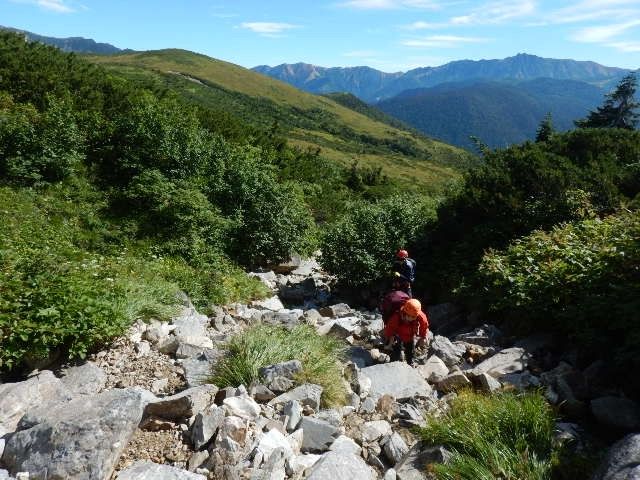 沢の水が枯れ、ゴーロの道を詰めてひたすら登る。しばらく登るとはるか向こうに青空と白い雲をバックに稜線が見えてきた。やった!と心の中で一人叫ぶ。朝5時出発してずっと休憩なし、ほぼ5時間連続して登っているので、さすがに疲れてきたし、お腹もすいた。 ゴーロと灌木帯を克服すると一面の草原が広がった。陽の光を存分に浴びて明るい緑が輝いていた。まだ残っている花もあり、今まで花をじっくり見る心の余裕がなかったので、ここでやっと花を愛でた。映画のワンシーンのような美しく壮大な景色で、サウンドオブミュージックのマリアが歌を歌っていそうな風景だった。背後には黒部源流の山々が惜しげ無くその姿を見せてくれたので、気分も爽快、頑張って稜線まで登りつめた。 9月にまだ咲いていた花に癒された 北ノ股岳への快適な道北ノ股岳まで来てやっと休憩。予定通り10時だった。素早く飲んで食べて風景を見る。槍ヶ岳が雲の間から姿を見せて感激した。やはり北アルプスに来たからには盟主の鋭角三角形を見ないと今一つ物足りない。実に恵まれた!!。しかし、ここでものんびりすることはできず、太郎平まで2時間で下る必要がある。赤木沢を無事遡行して、あとは安全に帰えればいいだけだと気持ちも開放されて、頑張って歩いた。太郎平着12:00。さらに折立まで2時間半。最後の一頑張りだ。どんどん高度を下げてはるか下に有峰湖が見えてきた。でもまだまだ遠い。あの有峰湖の横の道路まで下らなきゃならない。長くてだんだん集中力に欠けてきたので、Kガイドがとても面白おかしい話を披露してくれ、飽きずに談笑しながら下山できた。 遠くに見える有峰湖こうして無事折立まで下山し、山旅は完結した。北アルプスの山、沢、釣りを存分に楽しめた2泊3日だった。ハードスケジュールだったので、いつもより余裕が無く肉体的にもしんどかったが、それにも耐えて登れたのが貴重な体験になった。参考タイム 兎平5:00 →黒部川・赤木沢遡行・北ノ股岳10:00 10:10→太郎平12:00 12:10 →折立14:40