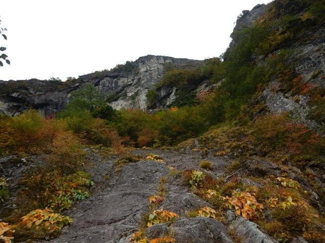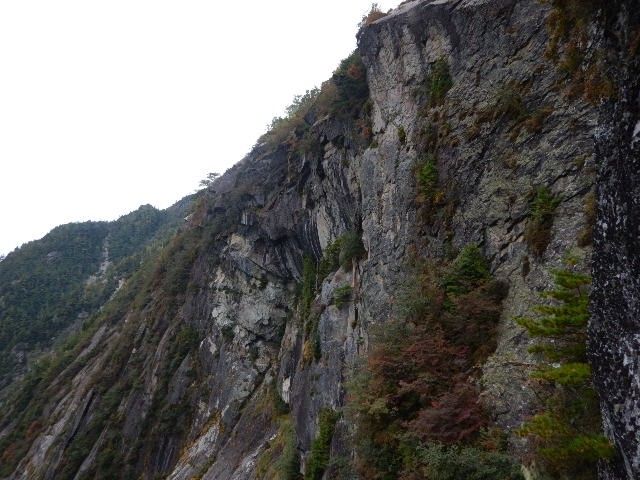 翌日9月27日この日までは雨が降らないという予報を信じて大凹角を登攀する。早朝3時50分起床、焚火を焚いてゆっくり支度し、5時30分いざ、出陣。大町の宿から急坂の唐沢を詰め、尾根に上がった所が右稜のコルで、ここで登攀用具を身に着ける。いつでも1個1個のギアを身に着けていく瞬間がドキドキワクワクして緊張感が心地よい。草付き帯をトラバースして岩場を一段上がった所が大凹角ルートの取付きである。一面の草が生えていてその隙間に岩が見える。 草が縦横無尽に生えている岩壁 1ピッチ 2ピッチ唐沢幕岩と他の岩場の違いは草付きが圧倒的に多いことである。小川山や瑞牆山のように純粋な技術的困難さはないが、露岩が少ないため、ルートを読みにくい、草が水を内包しているため、岩に染み出しだり濡れていることが多く、グレードが5.9と記されていてもとてもじゃないがそのレベルではなかった。全9ピッチ中、通常のクライミングができたのは1ピッチ程度であとはワイルドこの上なかった。あちこちにお助け紐やカラビナが打たれているのだが、古びていて一体何十年前の物?という感じなのだが、その安全性をイチイチ吟味している余裕もなく、43キロ位ならどうにか耐えてくれるだろうと思って、使える紐は使った。 6ピッチ目 右壁が濡れていてステミングが決まらず滑る大凹角ルートは正面壁のハング帯と右稜のリッジに挟まれた凹状岩壁を昇る手ルートなので足元はスラブで凹角が連続する。何とか6ピッチをこなすと大テラスに出る。ここからは灌木帯を直上して中央バンドまで登っていく。 中央バンドへの灌木帯この辺りまで来ると紅葉が広がっていて秋山らしい風情を感じた。 中央バンドから上部岩壁に取付くとこのルートの核心8,9ピッチが出てくる。8ピッチ目も苦労したが9ピッチ目がやはりハイライト、真っ暗な大チムニーが覆いかぶさってきた。チムニー昇りは1年前にはやっていたがそれ以降全くやってないので、態勢作りに時間がかかった。でも昔取った杵柄で何とかこなして明るい露岩に出て更に草付きルンゼをひと登りしてトラバースすると終了点だった。 真っ暗なチムニー どうやって登るの? やっと終了点に到着してホッ!!参考タイム 大町の宿 5:45 取付き6:15 6:30 登攀開始 終了点11:30