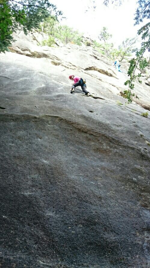 9月23日小川山にクライミングに出かけた。朝7時発のスーパーあずさ1号は新宿駅から通路まで登山スタイルの乗客でごった返す激込みだった。先週は台風で山には行けなかったのでみんな同じ思いなのだろう。朝はかなり雨が降っていたが甲府を過ぎると青空も出て、小川山はガスっていたものの雨は降ってなかった。昨日までの雨でかなり濡れているので乾きやすいスラブ状岩壁で昇った。下部は濡れ濡れだったが、陽が当たる上部は乾いていた。きちんとしたフリークライミングは昨年8月以来なので、外岩で昇れるだろうかととても不安だったが、次第に慣れてきて何とか昇れてほっとした。最初は私たちだけ3人の貸し切りだったが、午後になると3パーティほど来て、岩壁はスダレ状態にロープが張られて大賑わいになった。最初はかわいい女(5.8)から肩慣らしして、小川山ショートストーリー(5.9)と続け、慣れた所で高い窓(5.10b)オーウェンのために祈りを(5.10c)を昇った。実はオーウェンは以前は垂直で被り気味の壁がどうやっても乗越せなくて苦労していたのだが、今回は私より少しだけ身長の高い同行のOさんから有効なアドバイスを頂いてあまり苦闘せずに昇れてすっかり嬉しくなった。模擬リードで昇ったり結び替えの方法を教えてもらったり、学ぶことが多く、有意義な一日だった。やはり乾いた岩が楽しい。