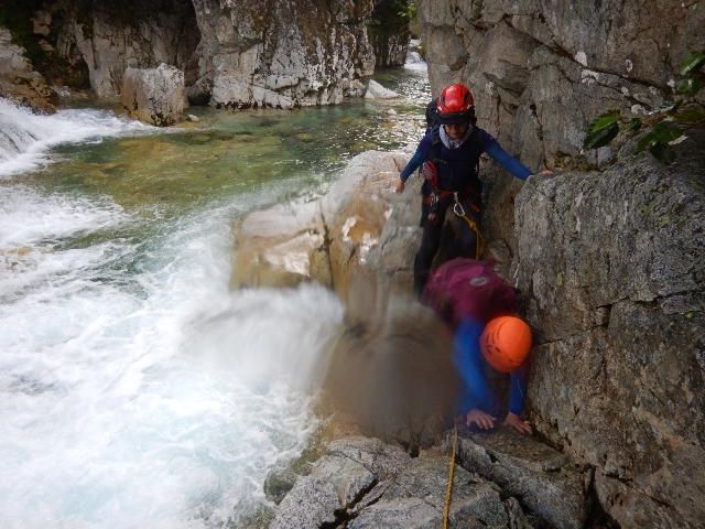 翌日朝3時起床、5時出発。昨日脱いで干しておいたタイツ、沢ウエア、沢シューズなどを身に着ける。全く乾いてないのでヒヤッとして寒いが、どうせすぐ水の中だからしばらくの我慢だ。 焚火にサヨナラして出発 朝はさすがに寒い!! 大岩を越える赤木沢と黒部川が合流する出合いまで下って、いよいよ赤木沢に入る。赤木沢は難しい所はなく初心者でも大丈夫、水は膝下と聞いていたが、膝下というのは標準身長の人の話で私にはもっと深い部分がけっこうあった。水流は黒部川ほどの勢いはなく、透明度が更にアップして陽の光にきらきら輝き、正に天下の美渓だった。しばらく歩くとすぐに美しい滝が次々に出現してきて、歓声をあげ続けた。 比較的短い滝が多かったので直接昇ったりしてどんどん高度を上げていった。寒さ対策に雨具の上着を着ているのだが、やはり寒い。動いているので体は冷えないが手がかじかんだ。なおも登り続けていくと正面に巨大な壁が行く手をふさぐように出てきて、その横に見事な滝がしぶきを上げている。大滝だ。 寒そうな顔してますね 正面壁と大滝この滝は直登できないため、右側から高巻きした。高度を上げると滝の落ち口をしっかり見ることができた。 大迫力の大滝を左に見て高巻きこの大滝を越えると、その後はかわいらしい滝が次々と現れ、川幅も狭くなり、両サイドには輝やく緑の灌木地帯や草原になり、源頭が近いことを感じさせた。 可愛い滝が連続