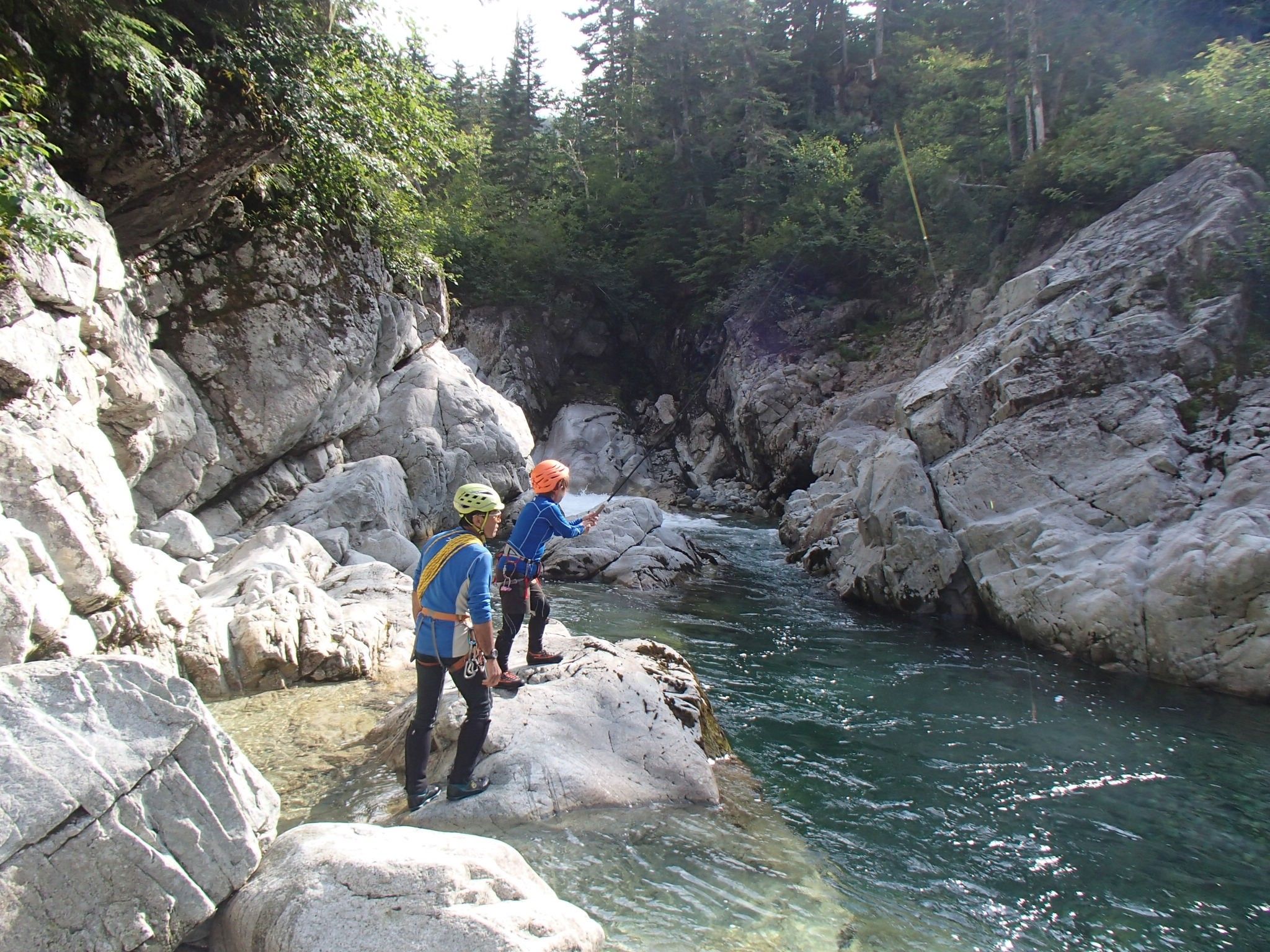 大凹角ルートを無事登攀できて喜びに浸ったのもつかの間、今日の夕方5時から雨予報なのでのんびりとはしてられない。しばし燃料補充したらすぐ下降にかかる。ここの懸垂下降はリスクだらけなので気を引き締める。まず終了点から懸垂ポイントまでが灌木をかき分けて行くため非常に分かりにくかった。最初の懸垂下降はあの大岩壁の空中懸垂なので豪快極まりない。 大岩壁の懸垂下降大岩壁の次はブッシュの中の懸垂でこれが非常にやっかいだ。灌木にロープが引っかかって降りにくい上、ロープが木に絡まったりして回収するのに骨が折れる。今回は絡まりを避けて短くピッチ切ったりしたこともあって7回の懸垂で取付きに降り立った。 ブッシュ帯の懸垂下降草付きを再びトラバースして右稜のコルへ戻る。ここまで戻ると地面に足がついた感じがする。更に唐沢を下って大町の宿へ到着。下山に向けて行動食と飲み物をしっかり摂って気持ちをリセットし、野宿用品を撤収して下山開始。 右稜のコルから唐沢の急坂を下る サラバ大町の宿この頃から高い峰には白雲がかかり、雨の予感がする。少し藪漕ぎや草漕ぎをするとすぐ沢に降り立った。気がせくがここからは再び沢登りの下りバージョン、焦ってはことを仕損じる、滑らないよう慎重に下る。 唐沢の沢下り 後は下るだけでザバザバ水に入る途中の開けた所で唐沢幕岩の正面壁がよく見えた。大迫力で迫ってくる。ここから見ても草付きや樹木が壁を覆っているのがよくわかるが大洞穴ハングも暗く巨大な口を開けている。あのハングを越えて「唐沢の中心で愛を叫ぶ」という5.13グレードのルートを開拓した人たちの情熱は凄まじい。この岩壁で最も易しい大凹角ルートだけでも楽では無かった。 唐沢幕岩正面壁ここを過ぎると更に空模様が悪くなってきたのでひたすら下った。思いのほか長く、ワシの滝を巻いて下り、金時の滝まで登り返し、懸垂下降でガリーを下り、ガレ場を過ぎてもなおも道は続く。予報より1時間早く4時頃から雨が降り始めていた。 歩き続けてやっと堰堤までたどり着いた。この頃には雨がしっかり降ってきたので雨具を着る。雨に打たれ、水の中を渡り、滑る大きな流木越えてただひたすら下る。遅くとも5時半までに高瀬ダムに到着しないとタクシーを呼べないので私もガイドも一生懸命だったが、時間もギリギリになっていた。 雨に打たれながら丁度5時半に高瀬ダムに到着、ダメかもと思っていたらそこへ丁度タクシーが来て、便乗させてもらった。何と言うラッキー!!ああ、助かった。無事生還。参考タイム 大町の宿 14:30 高瀬ダム 17:30