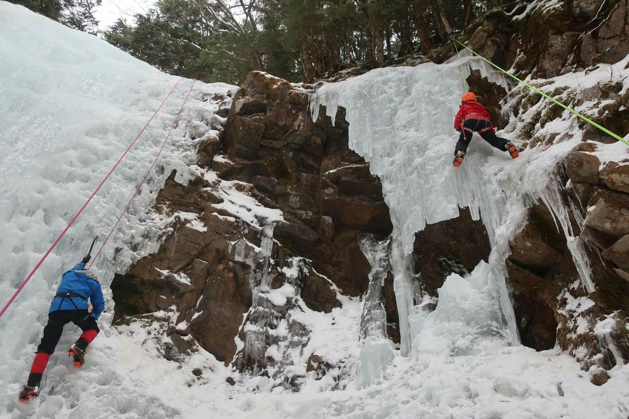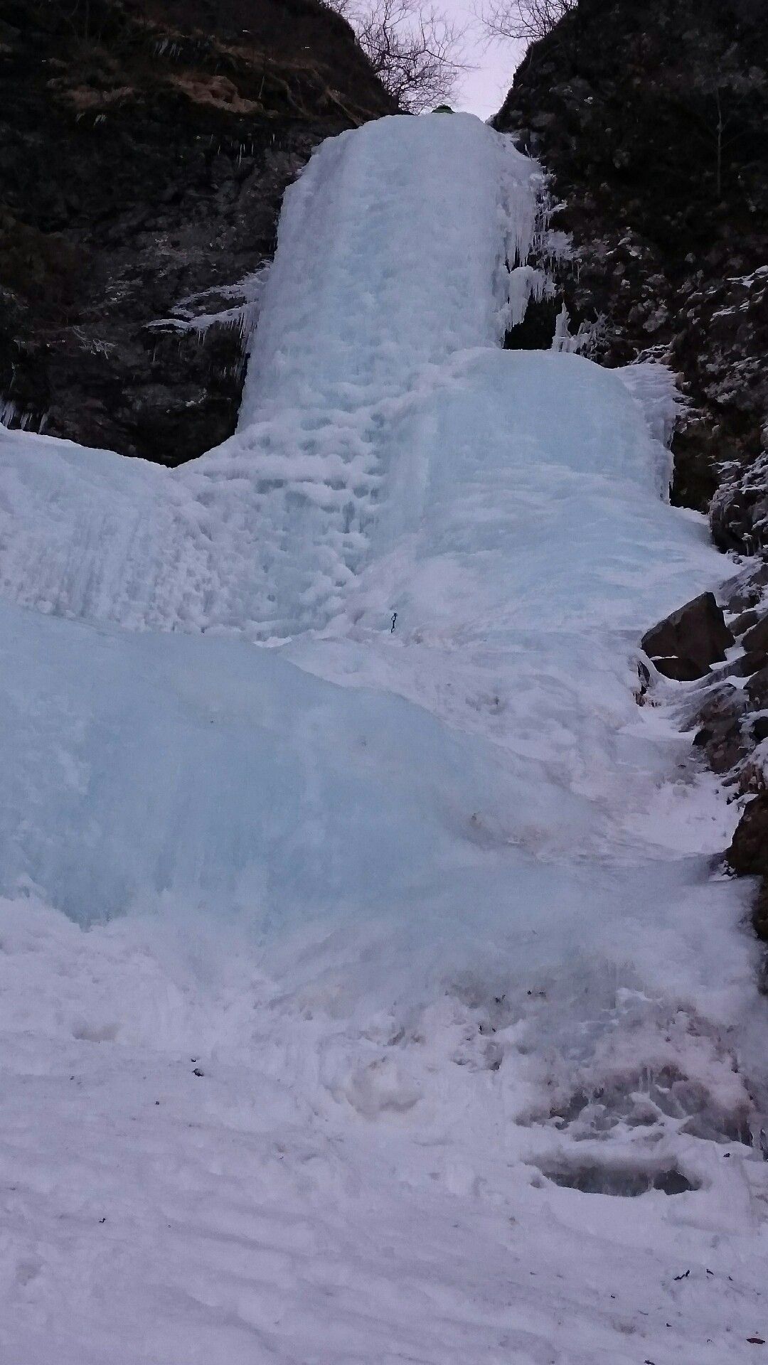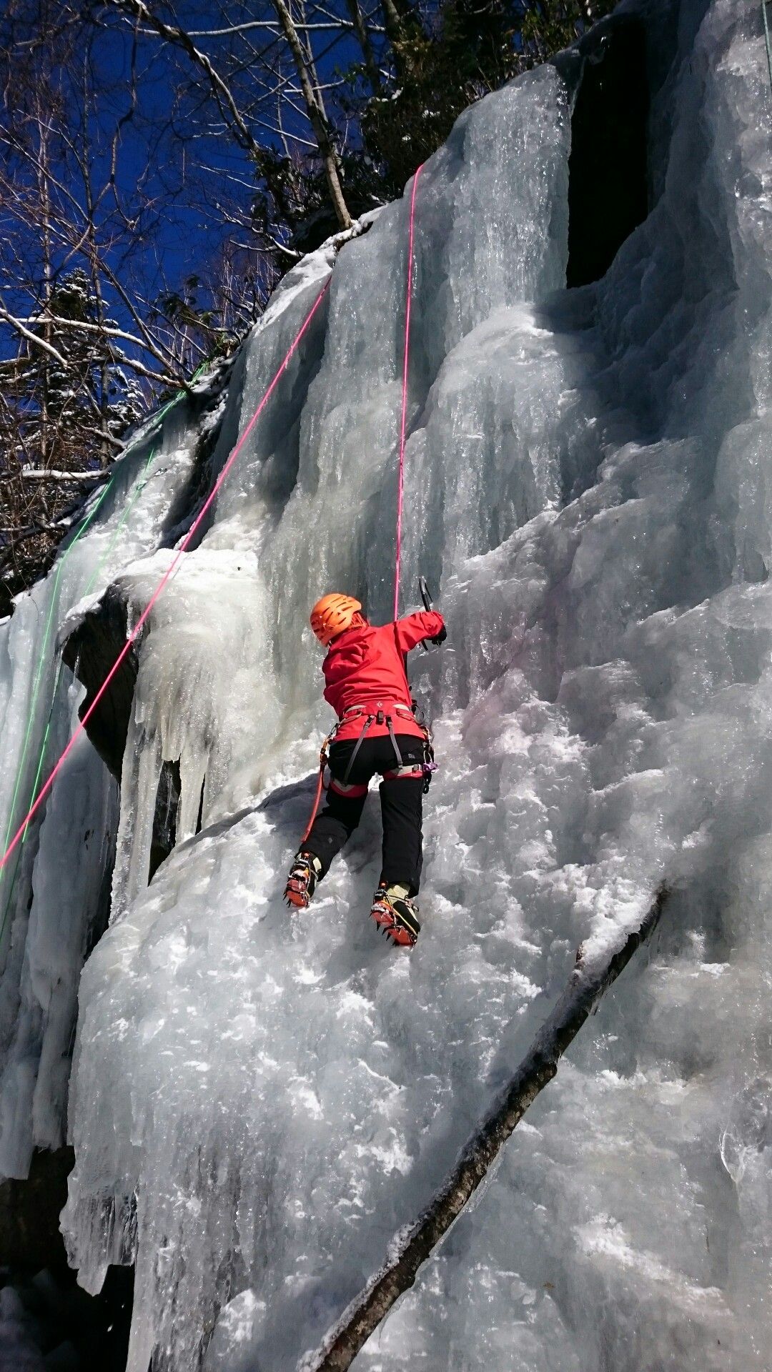 2月11日建国記念日。朝9時半松本駅集合、車で乗鞍岳の駐車場まで移動する。約90分ほどかかった。何度も通った梓川沿いの道路をぐんぐん奥に入っていく。道にも樹林帯にも雪はなかったが、釜トンネルを左折して乗鞍岳方面に向かう頃から雪が見えてきた。標高が上がるにつれて純白の乗鞍岳が姿を見せ、青空に映えて素晴らしかった。 乗鞍岳駐車場はほとんど満車状態だったが何とか入れ、そこでクライミングフル装備して雪の斜面を15分ほど下って善五郎の滝に到着した。途中にある滝見台から善五郎の滝の全景が見え、なかなか立派な滝だ。そして何と言ってもアプローチ15分というのが素晴らしい。リゾート気分だ。 滝見台より俯瞰する善五郎の滝全景滝に到着したら11時過ぎだったこともあり、中央正面壁には既にクライマーが取りついて昇っていた。止む無く左側壁に2本トップロープを張ってもらってそこで練習した。参加者は5名、久しぶりの方や初めての方もいて変化に富んでいたが、皆さん素敵な方ばかりで楽しく昇った。 Sガイドがアックスを持たず私が出した毛糸の手袋で氷瀑を昇ったのには驚いた。Hガイドもハングを華麗なムーブで乗りこえてみせた。さすがガイドの技だとみんなで感心した。 手袋でアイスクライミングするSガイド 華麗なハング越え Hガイド 3時半に終了撤収し、再び駐車場へ戻って帰路に着いた。松本駅に到着したのは18時過ぎだった。電車組のみんなで天婦羅そばを食べて親睦を深めた。楽しい滝巡りアイスクライミングツアーが無事終わった。