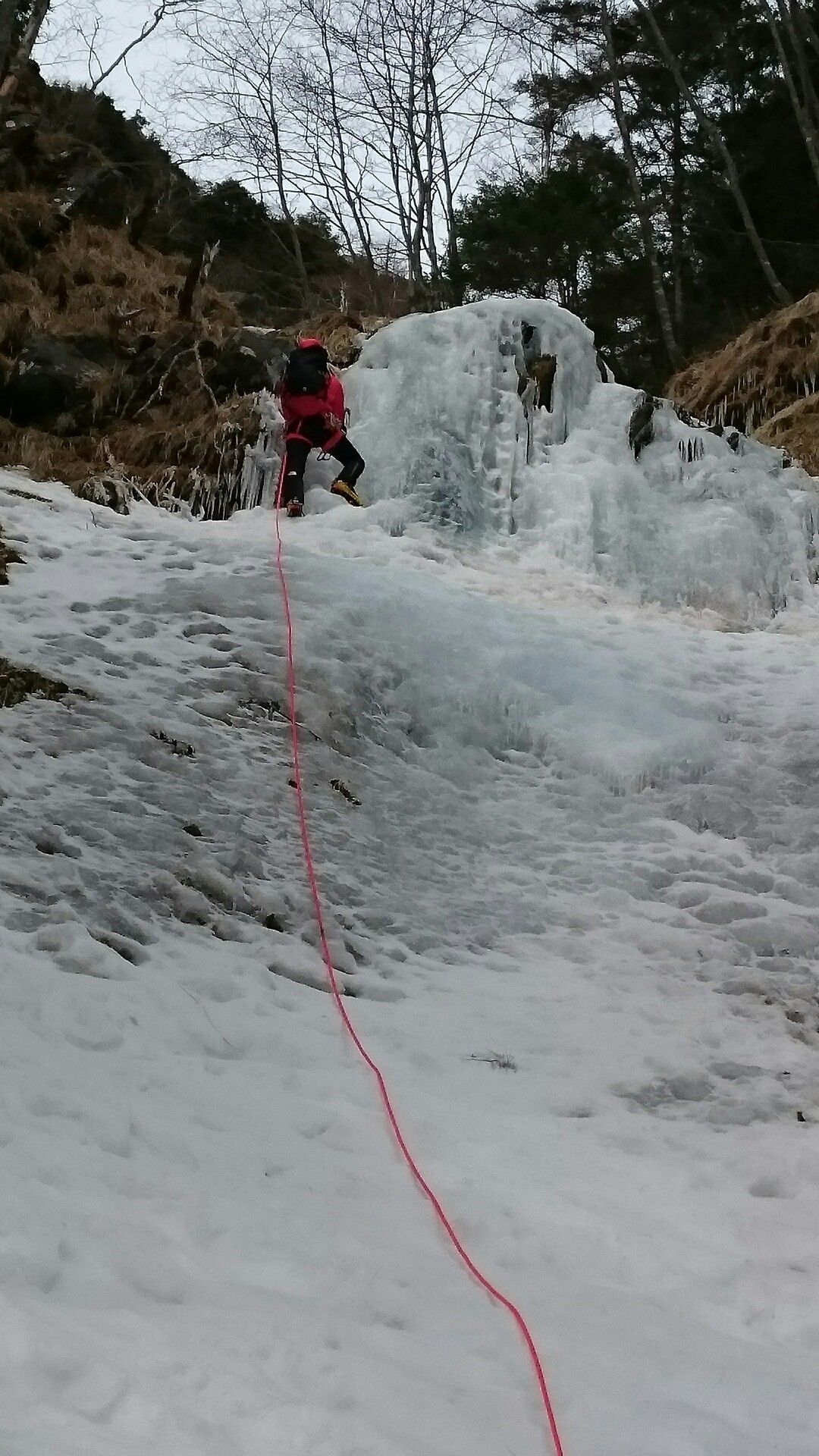 翌2月21日朝7時半に赤岳鉱泉小屋を出発し、大同心大滝に向かった。申し分ない晴天に恵まれたが、大同心大滝のある場所はとても寒いので、脚が攣らないよう両太ももにホッカイロを貼った。1時間弱急坂を詰めると大同心大滝が姿を現わした。思わず「おお!」と声が出てしまった。見事な氷瀑が天を突いていた。 静寂の大同心大滝 同 遠望 前回この氷瀑を昇ったのは何年前だろう。まだアイスクライミングに慣れてないけど意欲だけが先行している時期で技量不足、そしてメチャクチャ寒い2月の日だった。余りの寒さに手指がかじかみ、アックスから手が離れ、氷瀑の中ほどにアックスを残してしまったことが昨日のように思い出される。 8時過ぎに取りつきに到着したら既に先行パーティがいて昇っていた。 この氷瀑はかなり長く三段になっていて1段目、2段目は易しく、3段目がバーチカルでグーンと難度が上る。まず左側ルートをSガイドがリードして続いて私が昇った。沢山のクライマーに昇られていて穴ができていてそこに引っ掛けるように差し込んで昇ると楽だった。回収で が氷に食い込んでいて非力の私は快調に回すことができず手間取ったがまずまずの出来だった。 左ルートをリードするSガイド マルチで昇った後は右ルート、中央ルートをトップロープで昇った。右ルートは快適に昇れたが休みなしで昇ったせいか最後の中央ルートがギクシャクした。でもこの時間にはもう誰も居なかったので氷瀑を独占して3本も昇れてラッキーだった。とても充実した。
