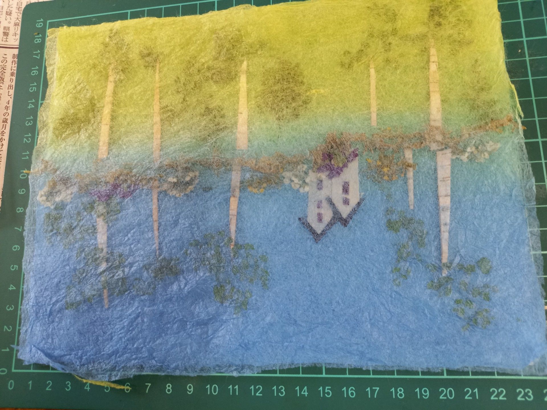 9月8日1か月ぶりに押し花教室に行った。前回は鳥海山に登ったのでお休みしていたのだ。その上、大槍・小槍登攀から帰宅したばかりなので全体的に現実感が薄れている。そんなボーとした状態で教室に出かけたのだが、エアコンを23度に設定してあるのは良いとして換気のために窓を2か所開けてあるのでもう暑くて汗がにじんだ2時間半だった。マスクがとにかく辛い。肝心の押し花といえば細かな作業の連続でまたまた手先がうまく動かなかった。まず和紙を細かく揉んでニュアンスを出したものを台紙の大きさに切り抜く。湖に映る風景を作るので湖と地上の境目をどの位置にするか、家をどこに置くかが重要になると先生から言われて湖を深く取る。その和紙の上に自宅で作ってきた白樺の幹を数本レイアウトし、アジアンタムの枝を添える。それを地上部分と湖に映って反対側になる湖部分を作る。湖部分が難しかった。 台紙に和紙を合わせる 家の位置を決め、白樺と葉を配置する更に水面と地上の境目に苔を一直線に敷き詰め、その上に小花をレイアウトしていく。小花は結局、黄色の女郎花、白の 、ピンクの野草を使った。ほかの花は大きすぎて使えなかったのだ。 白樺・苔・小花をレイアツトここまでが第一段になる。次はこの上に薄い和紙をかぶせて更にリアルな風景を重ねて作りこんでいく。要するに今日は奥行きを出すための第一段を作ったことになる。 1段目に薄い和紙を被せたところ本日はここで終わり。暑い中で集力を試される作業でなかなか疲れたが一応中ここまでできれば上出来ということにしよう。