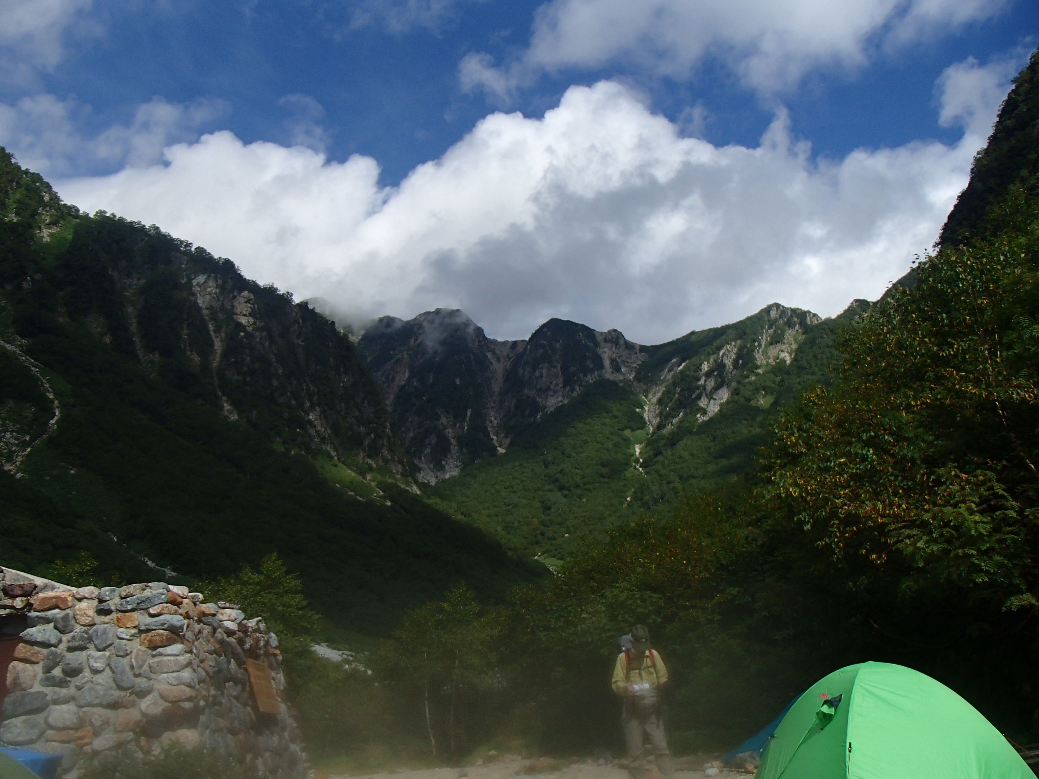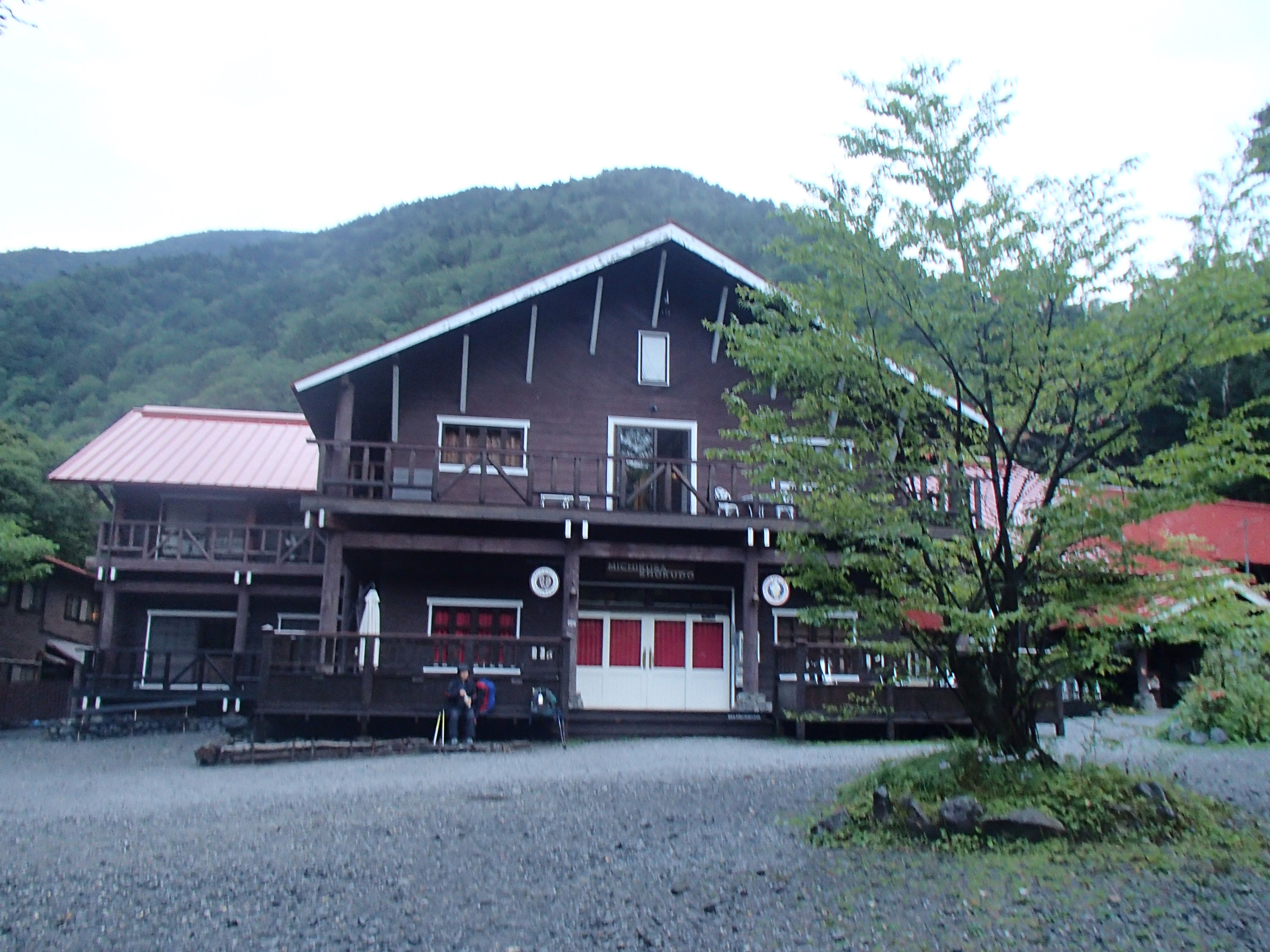 9月4日朝2時起床3時出発の予定だったが、夜半から音をたてて雨が降り続いているので、3時起床4時出発に変更になった。といっても一度2時に起きたらその後はもう眠れず、布団の中でじっとしているだけだった。ヘッドランプをつけて3時に西糸屋を出発。雨は一応止んでいて星空がのぞいていた。暗闇の中を黙々と歩く。皆さんのスピードが速いのでそれにペースを合わせて歩くの一生懸命だった。歩き続けて50分弱、明神へ到着。すっかり夜があけてヘッドランプ無しで大丈夫になった。給水・トイレを済ませ再び出発。次は徳沢園に到着。広々とした草地にテントが数張り見える。 早朝で無人の明神 徳沢園 前穂方面更に歩を進めて次は横尾まで歩く。このあたりまではほぼ平坦地なので黙って歩くだけだが私の通常のペースよりは速いので汗をかいた。横尾にはそこそこの登山者がいた。ここまで明神、徳沢園で水が飲めるので水を持たなかったが、ここでこの先分の水を汲み、プラティパスを満タンにした。今日は長時間だし暑いので水の不足は死活問題になる。前回鳥海山で足がつったので水分と塩分不足を厳重警戒している。しばらく歩くと左手に屏風岩が姿を表す。懐かしい屏風岩!!今年の地震で一部の岩が崩壊したと聞いた。 横尾の前 涸沢方面へ登る横尾橋 屏風岩横尾を出ると少しづつ道に傾斜が出てきて上り坂になってきた。おまけに雨も降ってくるのでカッパを着たり脱いだりの連続になった。どういうわけかお約束のようにカッパを着るとすぐ雨が止む。しばらくすると雨が降る!!。これを繰り返しているうちに槍見河原へ到着。何と槍ヶ岳がはるか遠くに見えた。これまで何度もここを通過しているがホントに槍が見えたのは初めてだった。槍見河原という名前は嘘ではなかったのだ。でもあそこまで登らねばならない。槍は遠く奥深い。 槍見河原から見る遥かな槍ヶ岳槍を見てちょっと良い気分にひたりながら二俣を過ぎ、やっと槍沢ロッジに到着した。ここまではよかった。