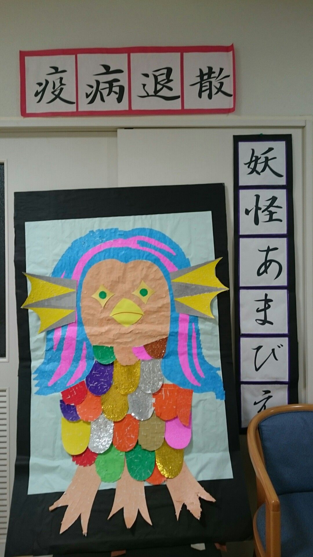 9月2日夫の薬取りに病院に行ったら妖怪アマビエの大きな絵が院内のロビーに飾ってあった。アマビエは日本に伝わる妖怪で海中から光を輝かせるなどの現象を起こし、豊作や疫病などに関する予言をしたと伝えられている。このアマビエはウロコ、三本足、くちばし、長い髪が特徴で半人半魚の妖怪なのだが、疫病を鎮めるとされているので現在のコロナ時代に注目されてきたとネットには載っている。この病院のアマビエは可愛い。コロナが初めて出てきた時点ではその正体がよくわからなかったこともあり、こんなに長引くとは夢にも思わなかった。少なくとも秋には収まっていると思っていたが、とんでもない。今年一年で終わりそうもない気がする。この先、一体どうなるのだろう。もう神頼みでもアマビエ頼みでも構わないから、早く終息して以前のような行き来のできる日常が戻ってほしい。アマビエ様、お願いしますよ。 ウロコ、三本足、くちばし、長い髪 特徴をよく捉えている