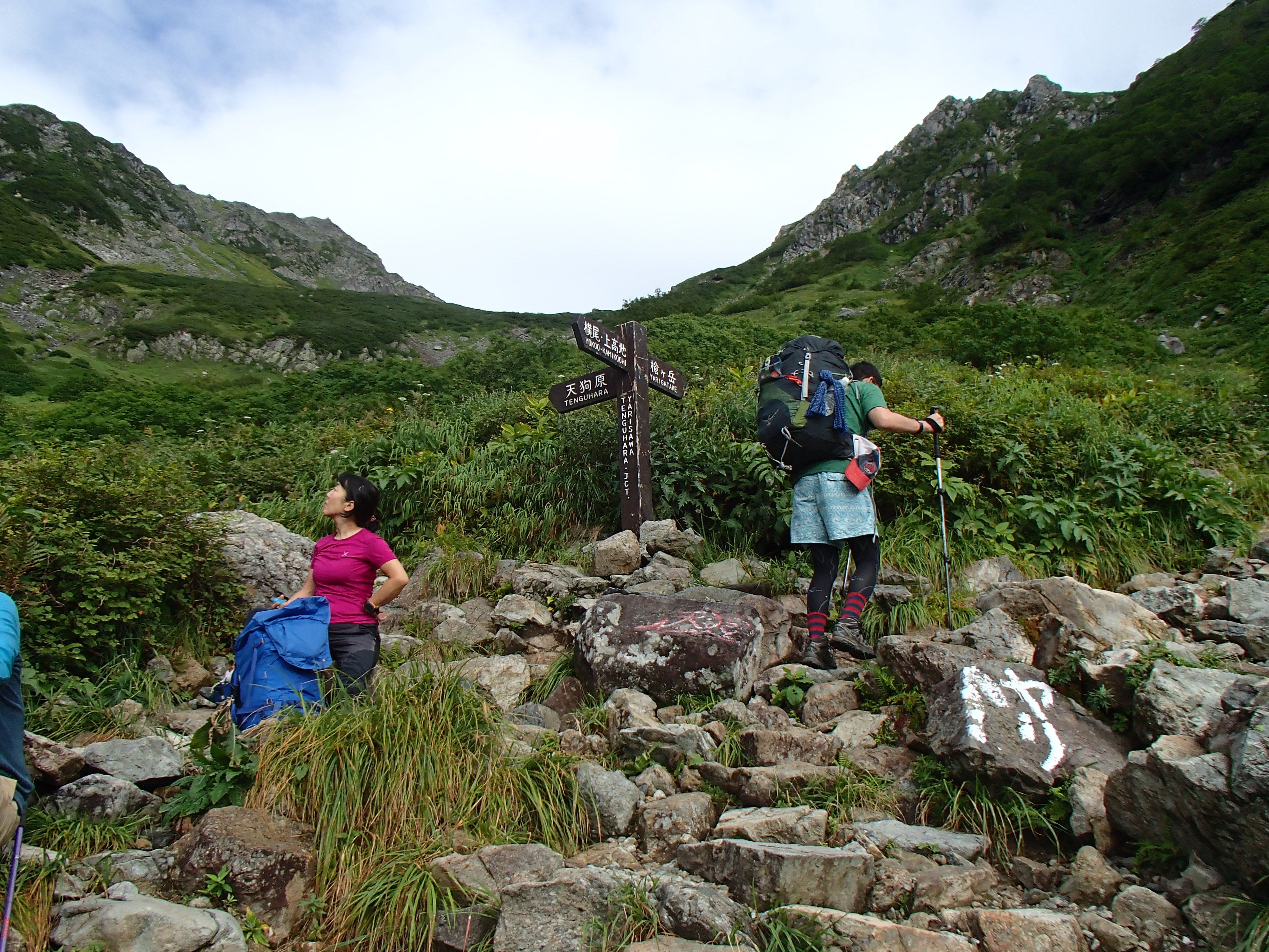 槍沢ロッジの前で水を飲み、行動食を食べる。ここで今回のツアーのメンバーを紹介しよう。国際山岳ガイドのSさんにHサブガイド、75歳男性Oさん、私73歳、71歳の女性Sさん、55歳の男性Rさんとその妻53歳のMさんという構成である。70歳代が3人と50歳代の夫婦にガイドが二人だ。槍沢ロッジを出ると本格的山道になり少し登った馬場平で一休みし、更に槍沢を詰めていく。 馬場平 アルプスらしい風景が展開する道はどんどん険しく急峻になり、ガラガラした岩くずが堆積した歩きにくい道になる。すぐ右手に大崩壊した赤沢山の赤ちゃけた岩肌が見えてくる頃になるととてもしんどくなってきて太ももが重くなってきた。すでに登山開始後5時間以上が過ぎている。耐えながら沈黙して進む。大曲を過ぎて天狗原への分岐を過ぎた頃から一段と苦しくなってきた。ガラガラの岩くずだらけの急坂を登っているうちに右太ももの付け根がギューんと攣ってしまった。鉄の棒が内腿に突っ込まれたような感じで激痛を感じ、そこで動きを停止。痛い!痛いとうめきながらしばらくじっとしていた。「皆さん、先に行っていて下さい」と言ったが自分の状態が辛かったし、情けなかった。そこで3分位停止していただろうか。原因を考えるに朝から自分のペースより早く歩いて汗をかいてしまったのが悪かった。塩分も同時に失われているはずだ。太ももの痛みが収まってからゆっくりと登山を再開した。かなりしんどかったがここで逃げ出そうにも逃げ出せない地点まで来ているので、何が何でも上に向かうしかない。上の景色は見ないようにして足元だけを見て数を数えながらマイペースで登っていった。するとしばらくしたら皆さんに追い付いていて「ナイスファイト!」と声をかけてもらった。忍耐強く登りに登ってふっと上を見ると槍ヶ岳直下の分岐を示す指導標があるではないか。上のほうに槍の穂がかすかに見える。えつ、もうここまで登ってきたんだ、もうすぐだ!とにわかに嬉しくなり、元気が出てきて気持ちが明るくなった。 分岐を示す指導標 雨の中に見えた槍の穂でも分岐からも遠かった。今度は今まで私と前後して登っていたOさんが突然足が攣ったと言って停止してしまった。サブガイドのHさんが横についてケアしている。私たちはじっくり登っていく。Oさんがますます酷くなって歩けなくなり、Hガイドが彼のザックをすべて背負ってOさんは空身で登り始めた。Hさんは50歳代の女性ガイドである。クライミングはお上手だかこんな重い荷物をもってこんな急坂を平然と登れるなんてすごいと思った。伊達にプロではない、いざと言う時にはそれなりの対応ができる。ヒュッテ大槍まであと200mという小さな看板を足元に見つけ、頑張って登った。そしてついに今夜の宿ヒュッテ大槍に到着した。ずっと雨の中を登ってきたので全身濡れそぼっていた。小屋前から遠くに富士山、目の前に常念岳が見えて高度を実感した。 雲海のかなたに富士山 やはりこの山を見ると嬉しいし気分が晴れる 三角形の常念岳