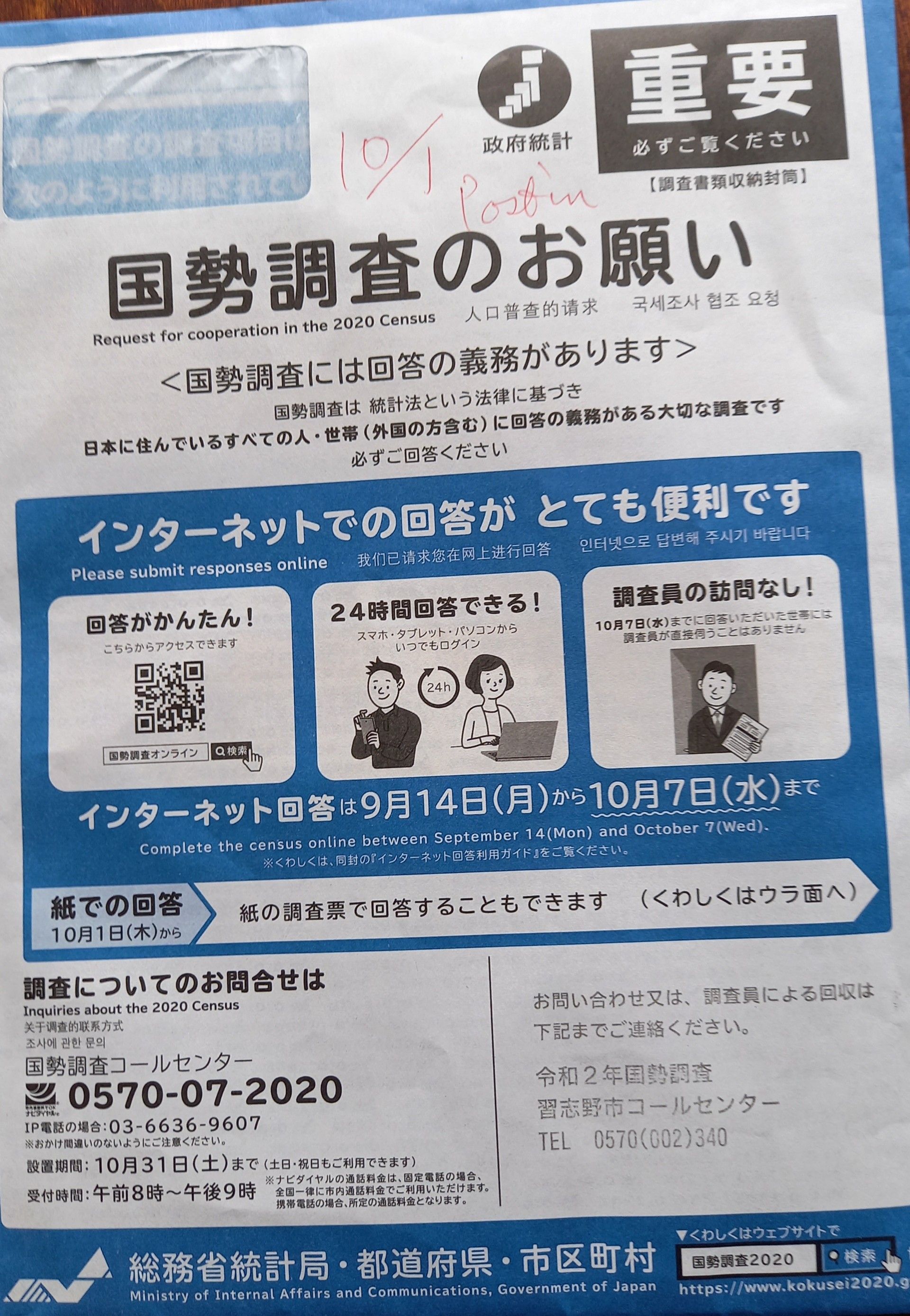 国勢調査の配布があった。ネットでやれば簡単と書いてあったが、すごく暇だったので鉛筆で記入した。手書きで書いてもたいしが時間がかかる訳ではない。ただ何をどう答えるかに決まりがあるので、それに従って回答するのがちょっと面倒なだけだ。暇つぶしには丁度よい。というわけで出来上がり。でも投函するのは10月1日以降なのでしばらく保留しておこう。国民の義務を果たした。