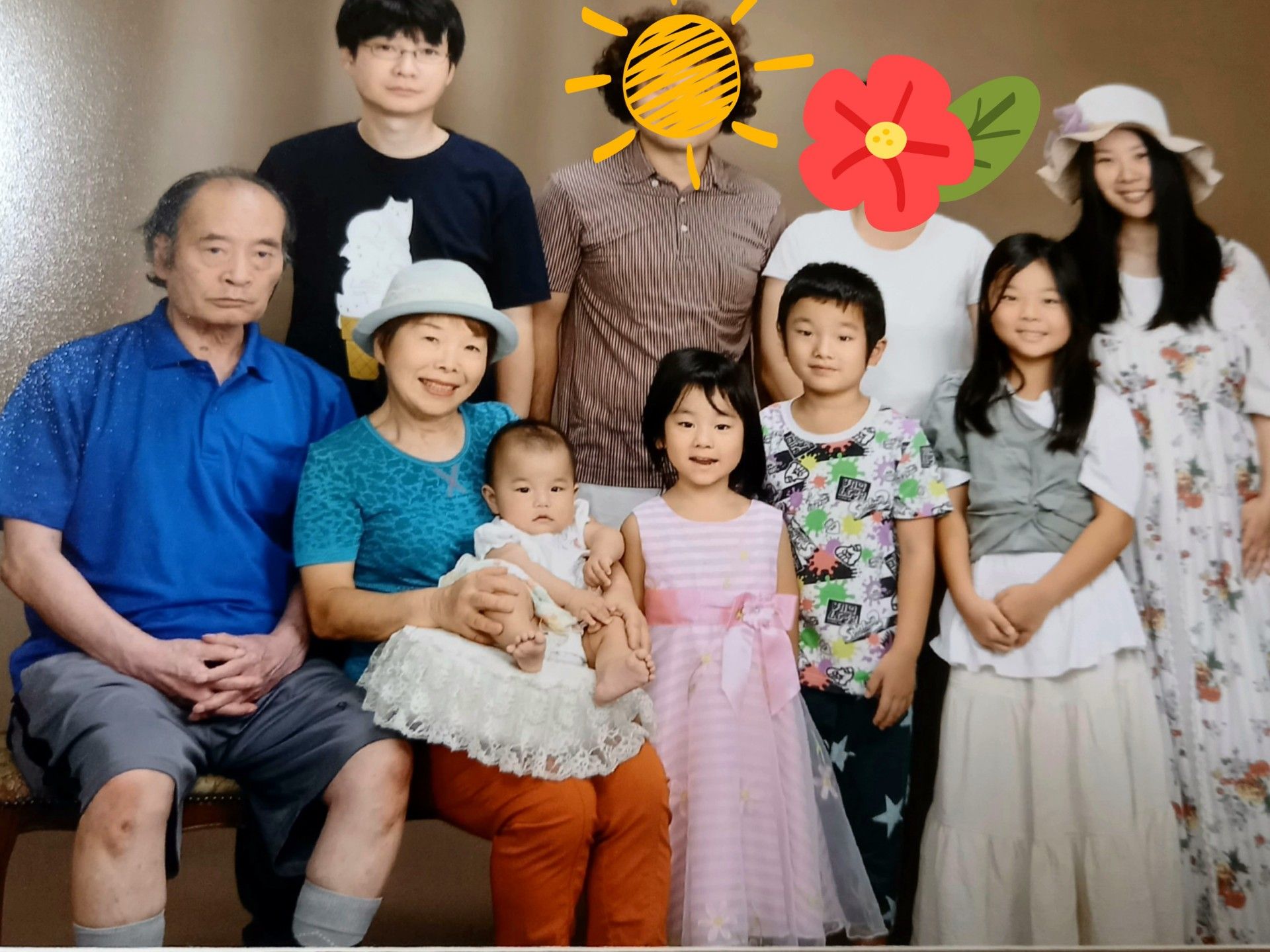 毎年夏に娘夫婦が里帰りするとき、家族写真を撮るのが恒例となっている。写真館は子どもたちが小学生だった頃からお世話になっている実籾の大関写真館である。今年もお盆前後に娘一家が家に来てくれたので写真を撮りに大関写真館に行った。我が家が4人、娘夫婦が子供4人と親2人の6人、合計10人の大所帯である。こんな子供ばっかりの集合写真を撮影するのは撮影する側も大変だと思う。子供は一刻もじっとしていない。撮影は昔はご主人だったが、今は代替わりして息子さんになっている。息子さんと奥様がいろいろな人形をまるで手品のように次々と出して子どもの興味を引き、よい表情を引き出して撮影する。それはものすごく見事でいつも感心してしまう。その素晴らしさとよい写真を撮りたいという撮影者側の熱意が30年以上もこの写真館で家族写真を撮り続ける理由である。奥様が私たち大人の姿もいろいろアドバイスしてにこやかな自然な姿になるようして下さる。その写真が出来上がってきた。娘宅にもさっそく郵送した。何と言っても孫4人が壮観である。左側から咲(8カ月)結(年中組)翔(少1)葵(小3)