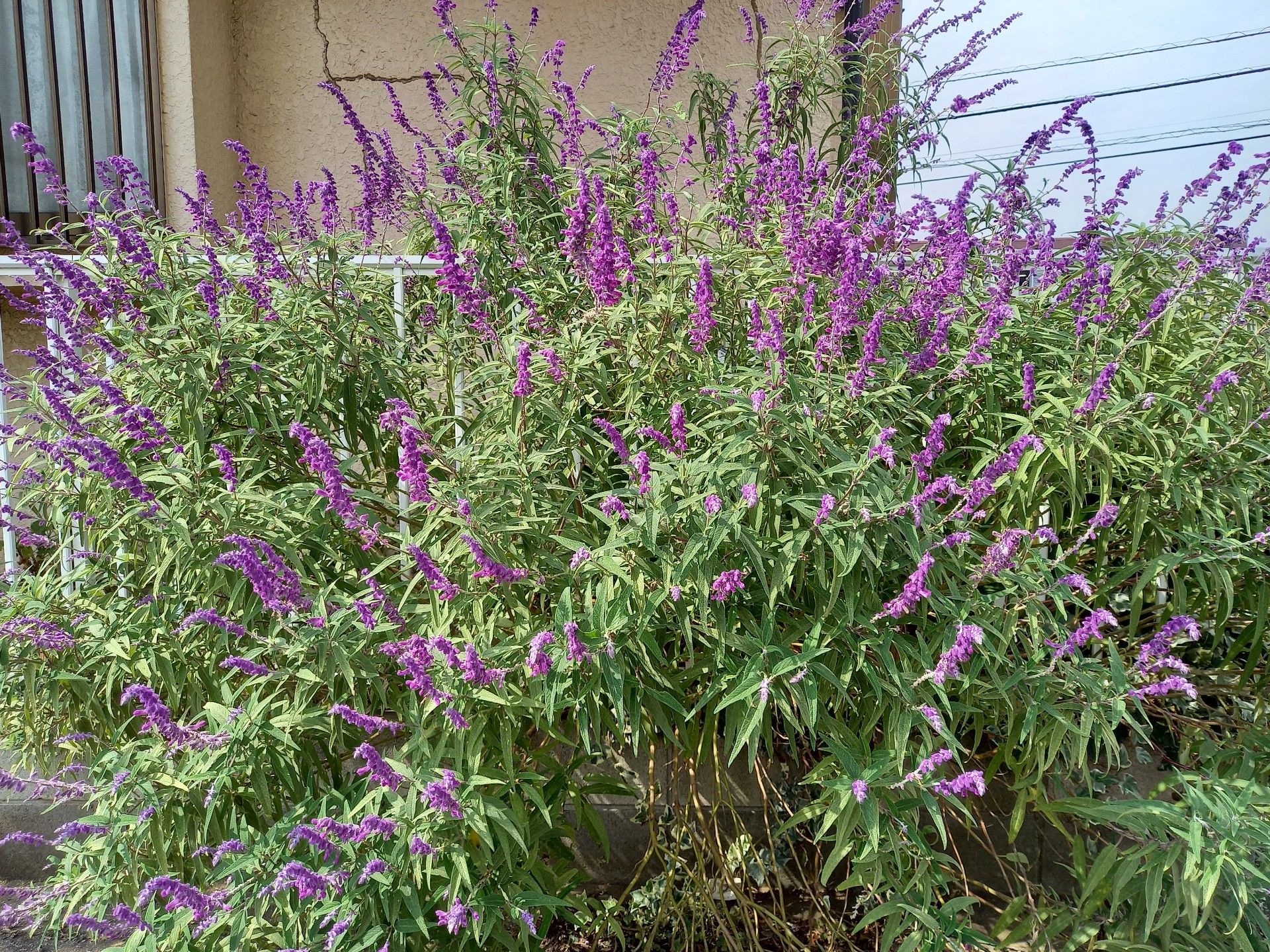 立山剱の山旅で4日留守にしていた。帰宅してみると庭のアメジストセージがものすごい勢いで咲いていた。この花は紫色が綺麗なので一株買って数年前に東側の陽当たりのよい場所に植えたのだが、その繁殖ぶりがすさまじかった。隣にバラを植えていたのでバラのために肥料をやるのだがその養分をほとんどこのセージが独占しているのではないかと思うほど、薔薇はあまり咲かずセージばかりが繁殖している。更に横幅3mほども伸び、フェンスの前に1mほどはみ出していて、通行人の邪魔になるのも気が引ける。でも花の咲く時期まで伐採しないでおこうと今日まで生かしてきた。こんなに盛大に花をつけてくれたのであと少し咲かせておこう。