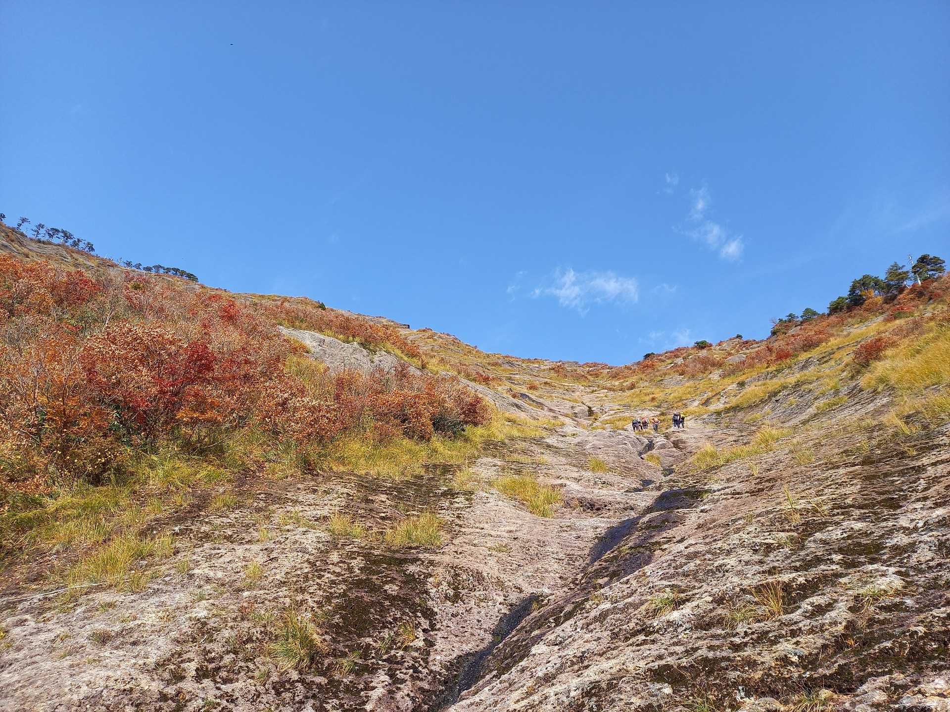 10月12日、昨日の夜、石和温泉に前泊して、今日は乾徳山中央稜と第一岩壁を登攀した。朝5時半にホテルを出発し、約1時間で乾徳山の道満尾根登山口である大平牧場に到着。牧場という名前ではあるが牛は飼ってなく、駐車場になっている。身支度を整えて歩き始める。取り付き地点まで普通の登山で、落ち葉の道を登っていく。秋の山は落ち着いてとても風情があって大好きだ。富士山が完璧な姿を見せてくれて心が洗われた。1時間半ほど登ったところで扇平に到着。一休み。マユミの実が真っ赤に色づいて綺麗だった。 朝の富士山 まさに秀麗富士 扇平のマユミの実そしてここからは岩が多い道が始まる。一般道でこんな岩場がでてくるからみんなビビるし、道は渋滞してしまう。私たちはどんどん進んで一般道から少し崖に出た所から懸垂下降を2回繰り返し、更にガラガラの道をトラバースしてやっと中央稜の取り付きに到着。アプローチ核心のような悪い道のりだった。 狭いチムニーを懸垂下降 旗立岩中央稜第一ピッチ旗立岩中央稜は全3ピッチ、第1ピッチが核心で2.3ピッチは岩稜昇りだった。ダイナミックな岩稜の稜線が連続し、とても面白く楽しかった。岩の背後にはダケカンバの黄色が広がり、とても美しかった。 黄葉をバックに中央稜の登攀中央稜を登攀後、少し移動して第一岩稜を登攀した。ここは1ピッチしかなく終了点は乾徳山山頂でつつましい祠があった。標高は2000mを越えている。 乾徳山山頂にて午後になると雲が出たりガスったりはしたが、大きく天気が崩れることはなく、程よい風が吹いて快適な登攀ができて気持ち良かった。その後は再び道満尾根を下って大平牧場へ下山した。おじさんが「お帰り」と声をかけてくれた。
