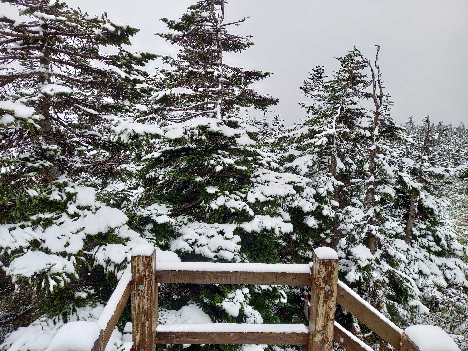 10月17日ツアー4日目。朝、窓の外を見ると雪がどんどん降っていたのでびっく仰天。まだ10月半ば過ぎでもう雪!!という衝撃が走った。消える様子もなくしっかり降り積もっている。出発時間を1時間遅くして八幡平登山口へ。雪が降ったのでアスピーテラインは閉鎖され、これ以後車は入ってくることができず、私たちは八幡平を独り占めすることになった。登山口から雪道を登って稜線へ出、八幡湖を眼下に見下ろしながらしばらく登ると山頂(1613m)に到着。八幡平そのものが平で起伏が少ない山なのでこの先はずっと気楽なハイキングだった。ツアー中、最も楽な行程だったが、雪が降って変化をつけてくれた。九州から参加した人は大喜びだった。 雪景色の森 寒々しい八幡湖 八幡平山頂山頂下の避難小屋で一休みした後は八幡沼の木道を歩き、オオシラビソの森の中を源太森(1595m)へ進んで雪景色を楽しんだ。 雪の木道歩きも楽しい あちこちに池塘が点在する 紅葉も美しい はるか遠くに岩木山雪が降るという予想外の天気ではあったが、登山に支障なく楽しい1日だった。