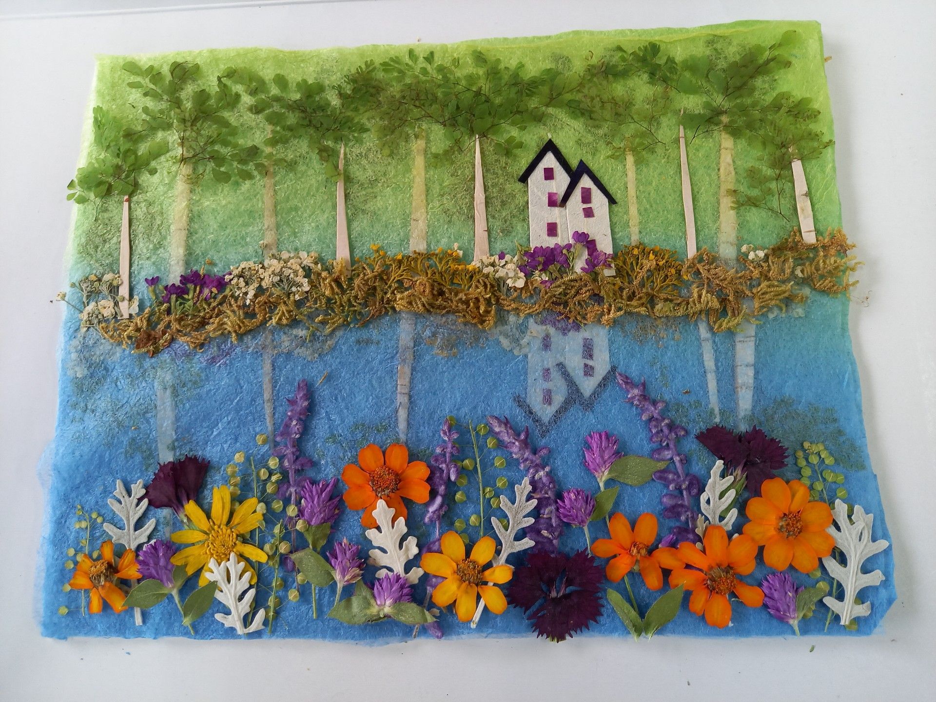 10月13日、昨日の乾徳山登攀から一夜明けた今日は押し花教室だった。早朝から登攀して帰宅時間も遅かったので疲れが残っているだろう、朝からイマイチ体がシャキシャキ動かなかった。でも頑張って新しい押し花も押して準備してきた訳だから自分を𠮟咤激励して出かけた。今日の作業は岸辺の手前に綺麗な花をレイアウトし、額絵にしたてることだった。以前のようにものすごく細かい作業ではなかったのでどうにかこなした。とはいえ細かい作業ではないもののセンスが問われる作業で、美的センスの持ち合わせがない私は自問自答しながらの制作だった。会心の作というまでにはならないが、一応完成したので非常にほっとした。原画 額絵に仕立てる 手前細部 水に映る家 この部分は気に入っている。使用した花 白樺の幹、アジアンタム大・小 苔、ジニア、ユーリオプスデージー、アメジストセージ、シロタエギク、野草、撫子、千日紅など