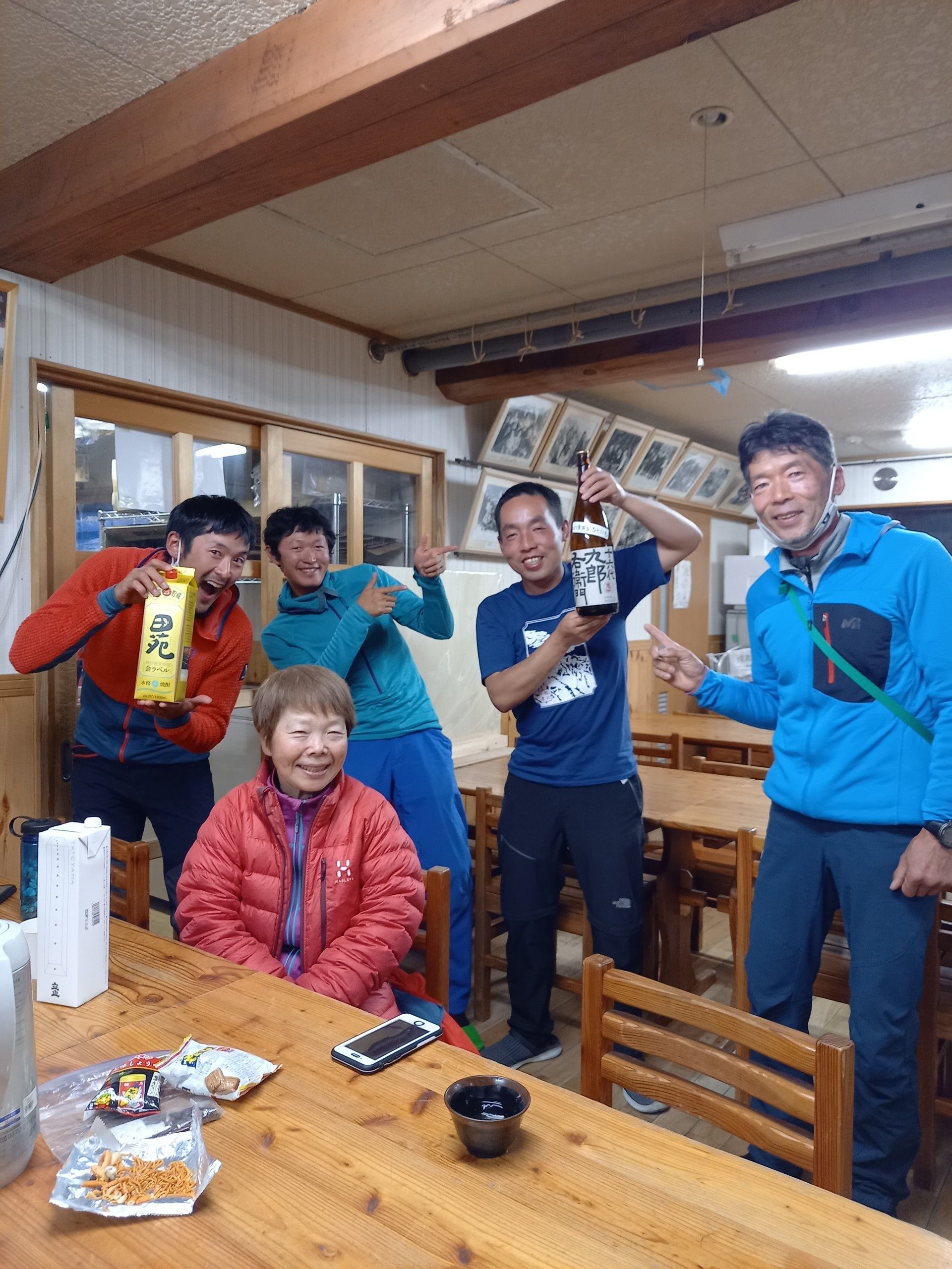 今回の立山・剱の山旅では剣沢小屋に二連泊した。剱岳登頂後はすぐ雷鳥沢に下山してもよいし、若い時はそうしていた。しかし今回は自分を過信しないこと、頑張らねばならない行程は組まないことをメインに日程を組んだのでこうなった。それに剣沢小屋はとても好きで登山者にとって心地よい小屋なのですぐ立ち去りたくなかったこともある。そして実際予想以上の楽しさだった。まずスタッフの対応が丁寧で親切、登山者が大切にされているということを実感させてくれる。そして食堂や部屋もコロナ時代に対応して感染防止策は万全だ。更に多くのガイドさんたちがお客さんを連れて泊まるので新しい出会いがあることも嬉しい。今回は地元立山ガイド組合のMさん、Sさんに加えて、小屋番のK2登頂者田口さん、真由子さん関連でFBで友達になっていた若いガイドのSさん、その友達のTさん、山岳警備隊のTさん、棚橋ガイド、そのお客さんの服部マコさん(舞踊家・女優!!)など沢山の皆さんと過ごせてこの上ない楽しさを味わった。下界でこんな気持ちよく楽しいことはほとんどない。 若さ・楽しさが弾けて 1日目の夕食 ビーフシチュー!! 2日目の夕食 トン汁が超美味しかった 全員同一方向向きで仕切りのある食事風景歯科治療で不在だった当主新平さんにも奥様にも下山中にお会いでき、更に喜びが増えたのだった。 雷鳥沢と室堂の間でお会いした新平さん